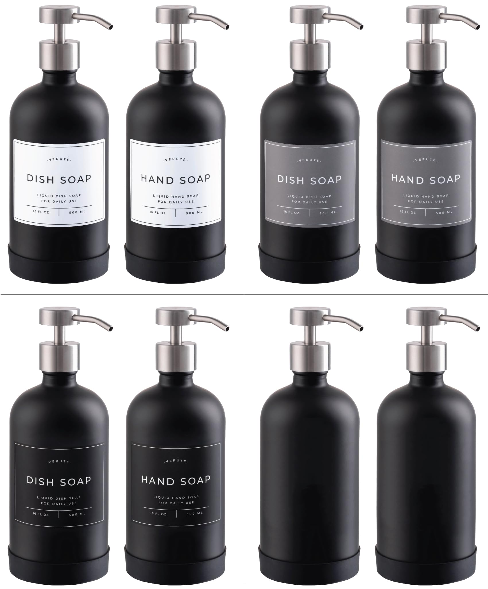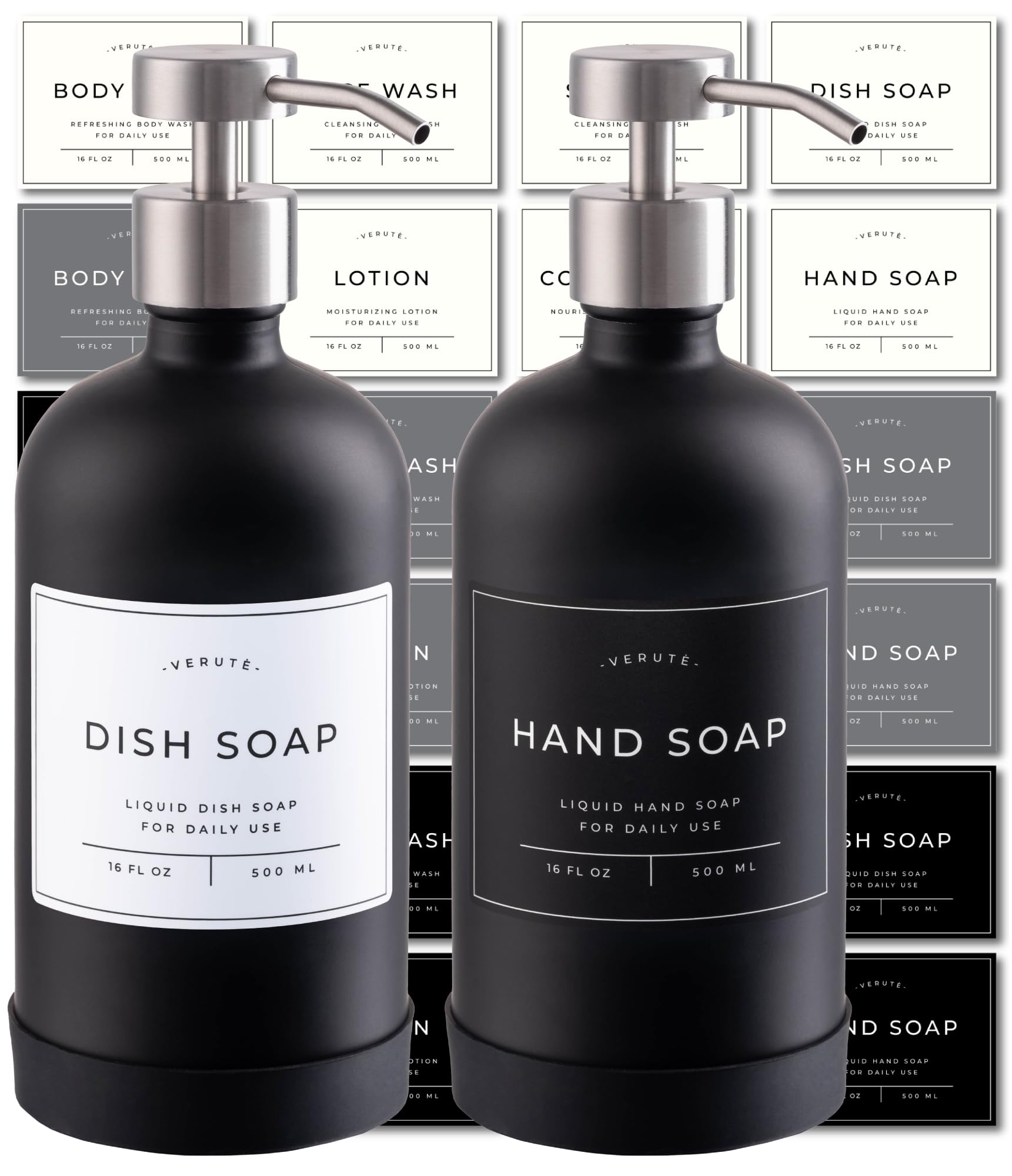 ORGANIZE YOUR HOME - Inside the set: 2 16oz glass bottles for your creams and liquid soaps; hand soap, dish soap, lotion, body wash, conditioner, shampoo and face wash labels in white, gray, and black colors; and 2 silicone trays.