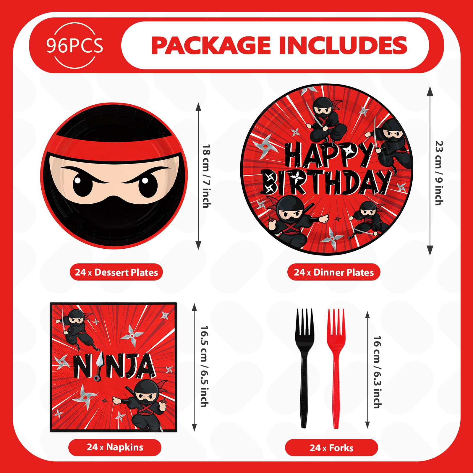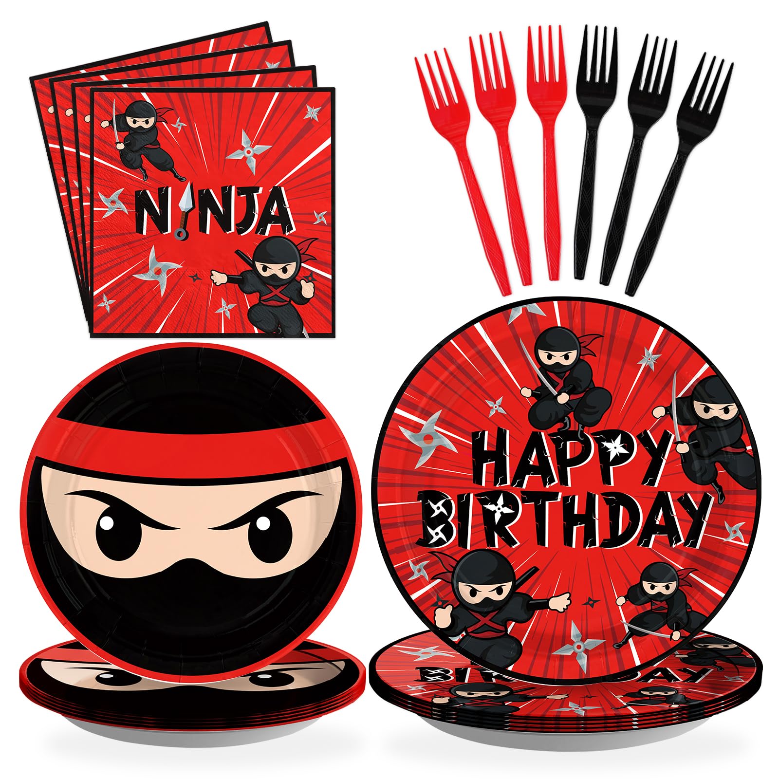 Complete 96-Piece Party Set: Host hassle-free celebrations with 24 red ninja dinner plates, 24 red and black ninja dessert plates, 24 premium 2-ply napkins (6.5x6.5 inches), and 24 sturdy 6.5-inch forks. Each ninja party favors set showcases matching red/black ninja artwork for a unified tablescape. The disposable design saves cleanup time, letting parents focus on party fun. Ideal for serving pizza, cake, snacks, or goodie bags—no mismatched tableware! Bonus: Stackable plates and compact napkin bundles simplify storage until your big event