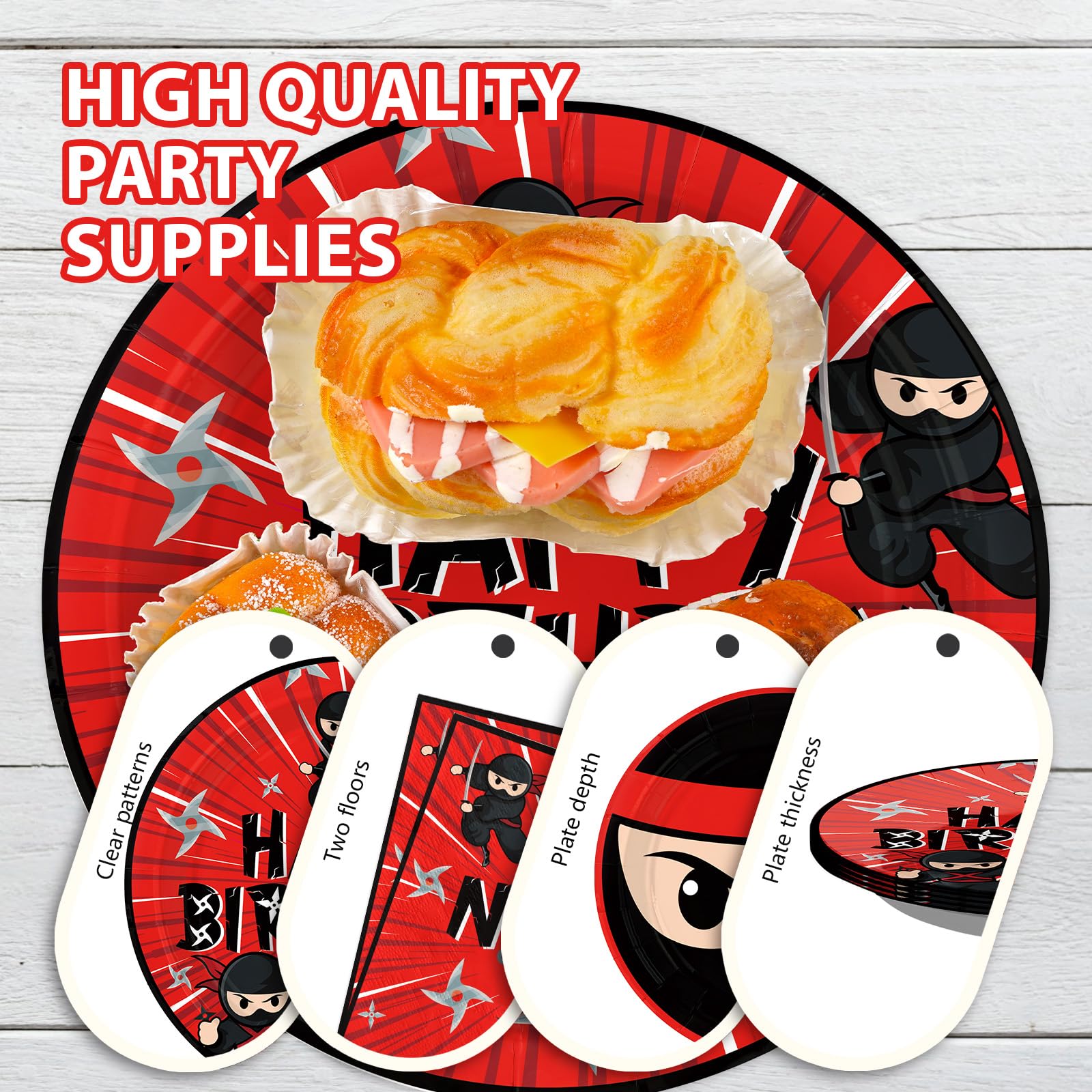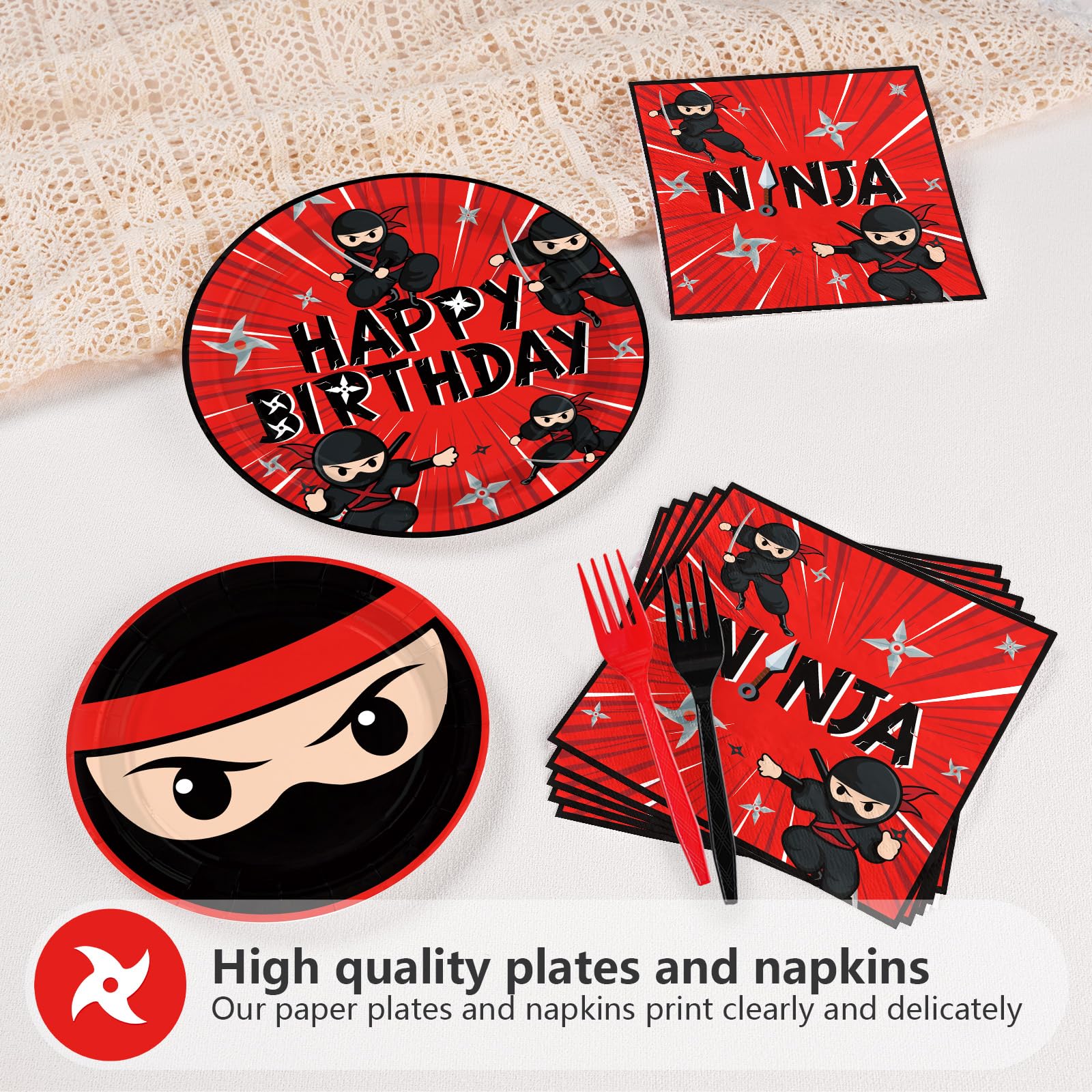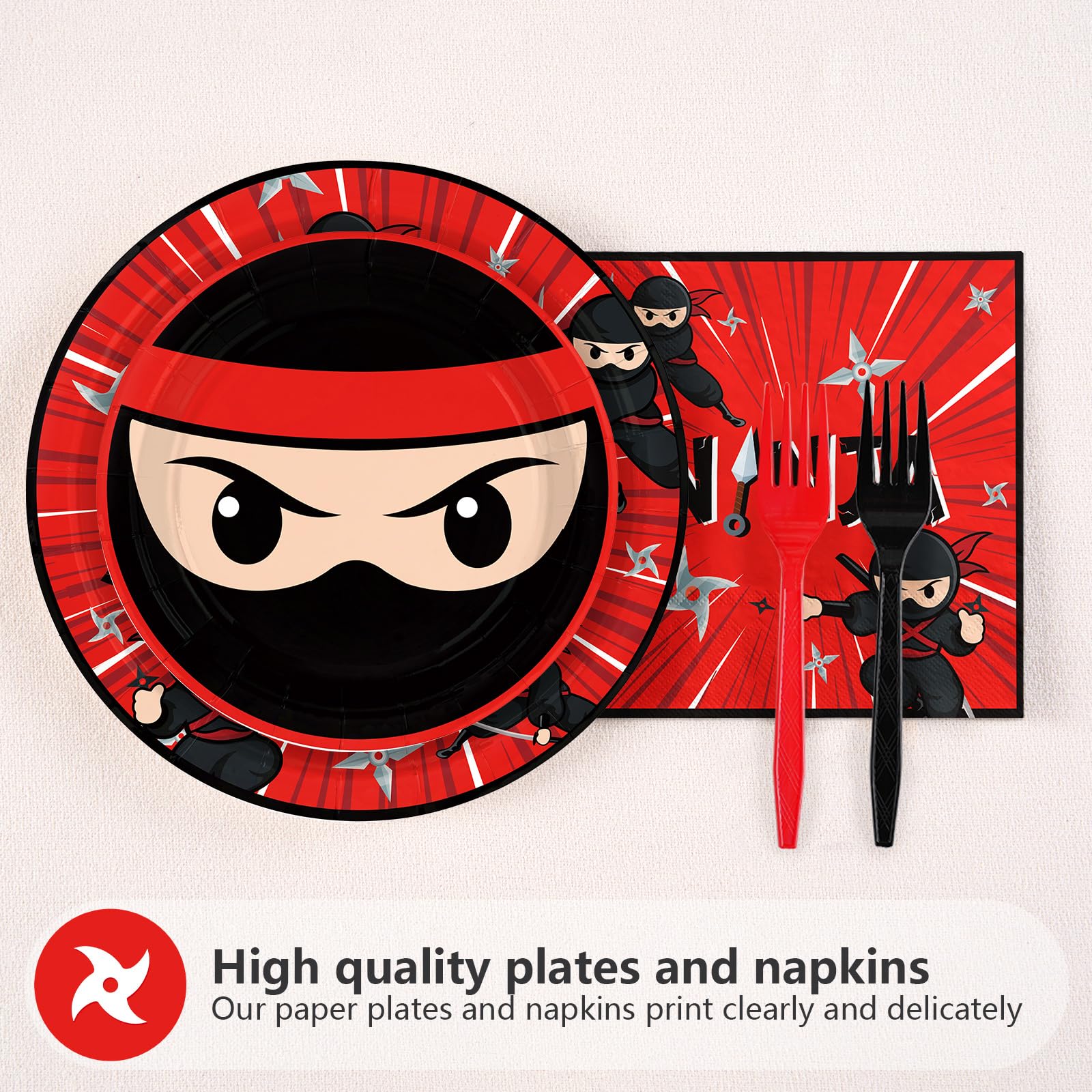 Dynamic Ninja-Themed Design: Elevate your party decor with bold red and black ninja-inspired patterns featuring shuriken stars, masks, and samurai motifs! Designed to thrill young ninja warriors, this set matches the edgy aesthetic of modern kids' parties. The high-contrast colors and action-packed graphics ensure a cohesive theme, making it perfect for birthday photos, table settings, or DIY ninja training camp decorations