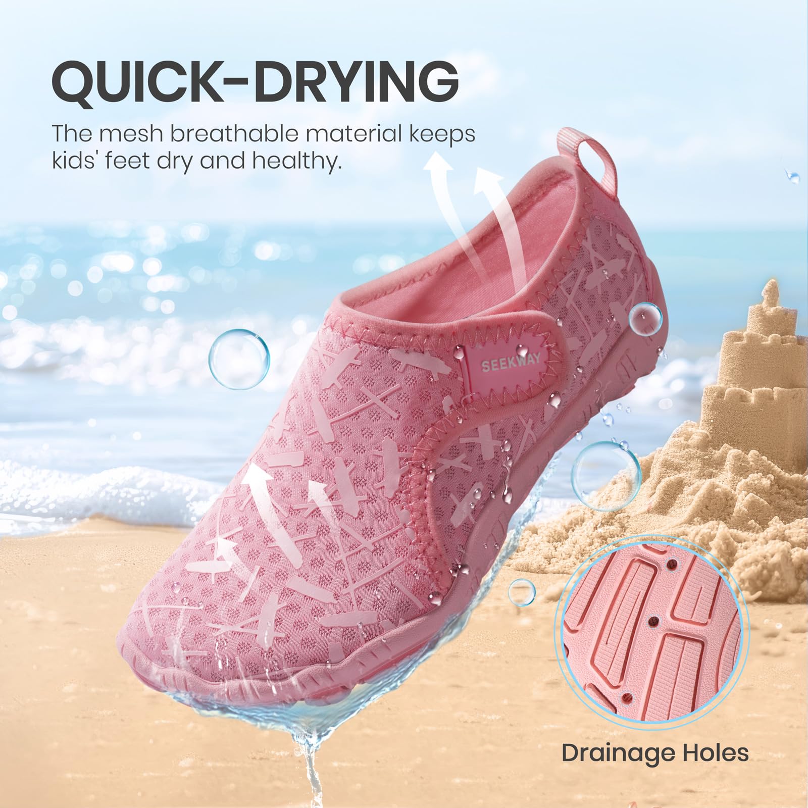 【Breathable & Permeable Material】: The mesh breathable material on the upper combined with drainage holes on the outsole keeps kids' feet dry and healthy.