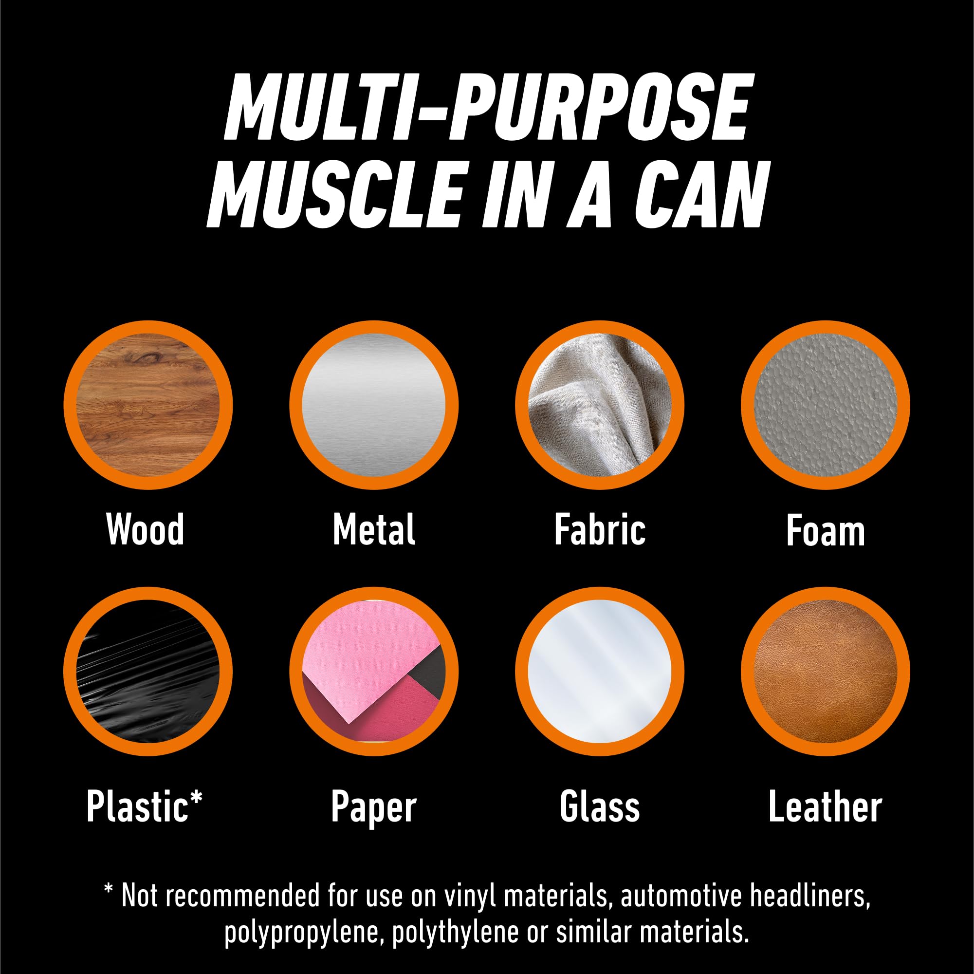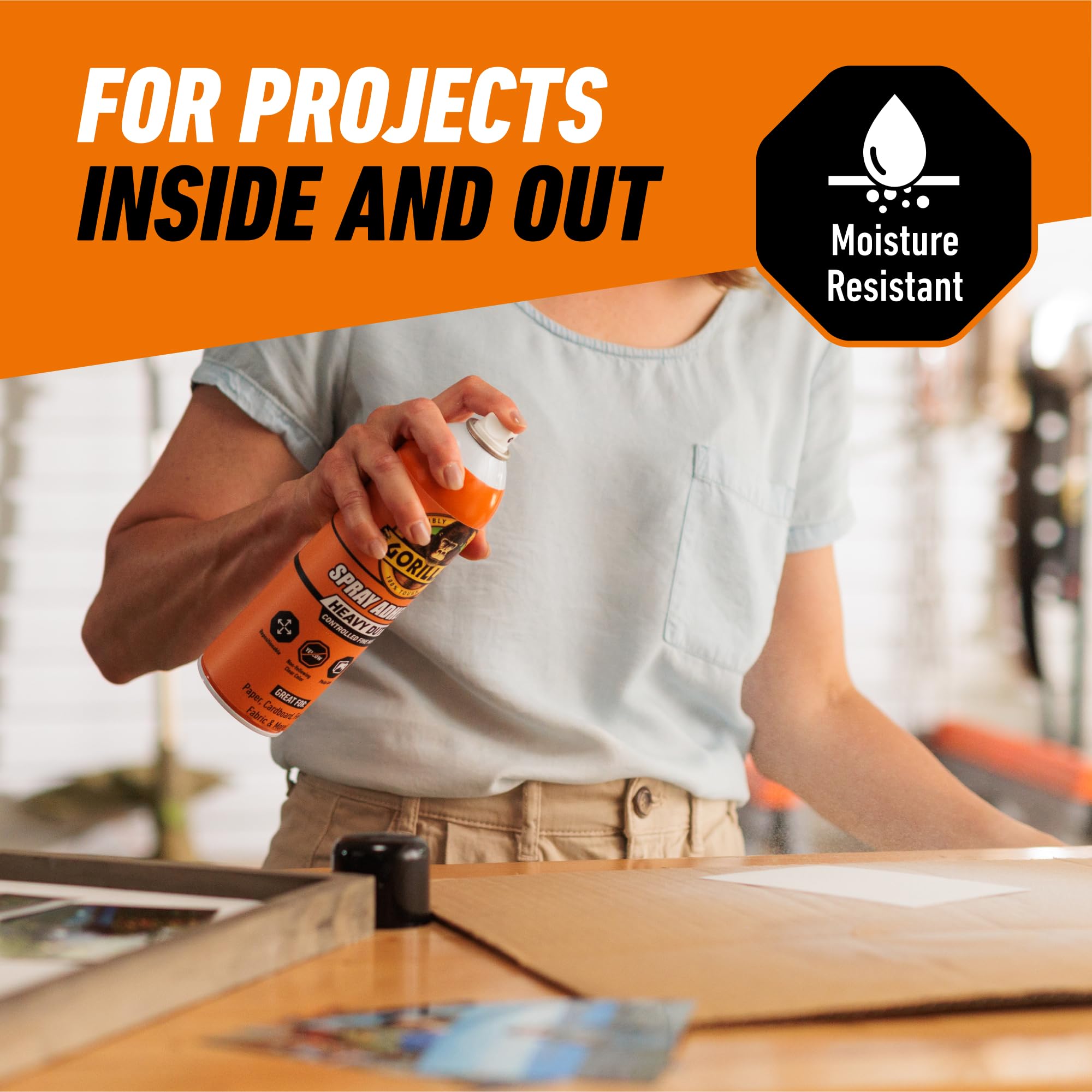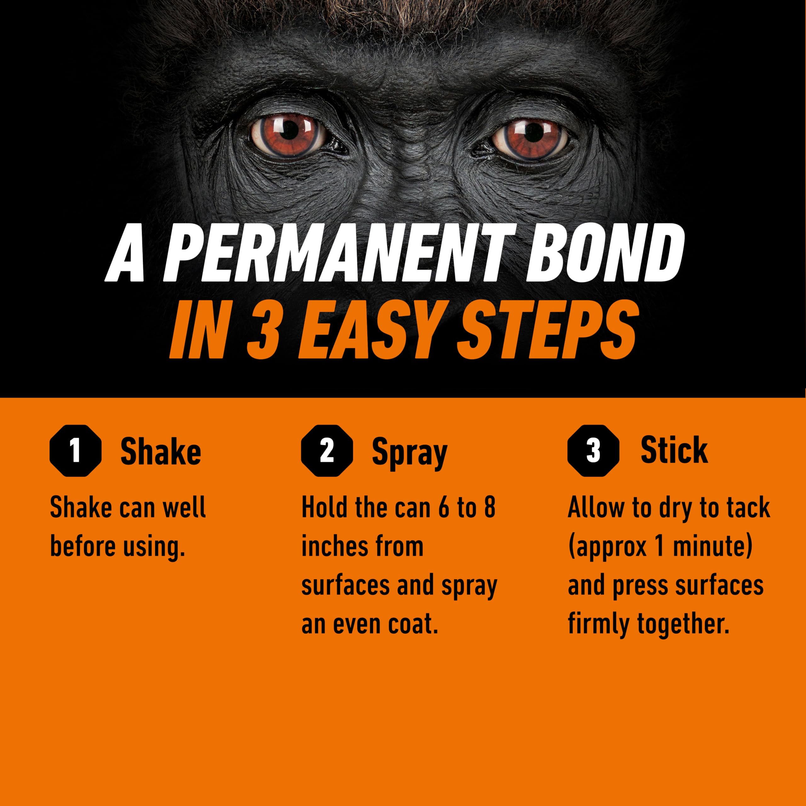 Gorilla Spray Adhesive is heavy duty, multi-purpose and easy to use. Gorilla Spray Adhesive forms a clear, permanent bond that is moisture resistant and can be used on projects both indoors and out. This spray adhesive is also photo safe. Its wide pad nozzle and controlled, fine mist spray provide an even application on the project you are working on. Gorilla Spray Adhesive is a multi-purpose product that will bond a wide variety of surfaces including fabric, paper, wood, plastic**, cardboard, foam, metal and more! **Not recommended for use on polypropylene (PP) or polyethylene (PE) plastics, vinyl, or any type of rubber with high oil or plasticizer content. Not for use on food contact surfaces. Do not use for bonding weighted materials. Direct UV exposure may affect color. DIRECTIONS: All surfaces should be clean and free of dirt, grease and oil. Protect surrounding areas from overspray to avoid residual adhesive. 1. Shake can well before using. 2. Hold the can 6 to 8 inches from surfaces to be bonded and spray an even coat of adhesive. 3. For Maximum Bond Strength: Spray both surfaces to be joined. Allow to dry to tack (approximately 1 minute) and press surfaces firmly together. For Repositionable Bonds: Spray a light even coat on one surface. Allow to dry 1-3 minutes before joining. Repositionable up to 10 minutes depending on surface type, then bond becomes permanent. To remove, gently peel from corner. Tip: To avoid possible clogging, turn can away from body, turn upside down and spray a short jet of clear gas after completing the job. STORAGE: After each use, wipe nozzle with a dry cloth and replace cap. Gorilla Spray Adhesive is a flammable adhesive that should not be used or stored near heat, sparks, flames or while smoking. Do not store at temperatures above 120F. Tip: To avoid possible clogging, turn can away from body, turn upside down and spray a short jet of clear gas after completing each project.