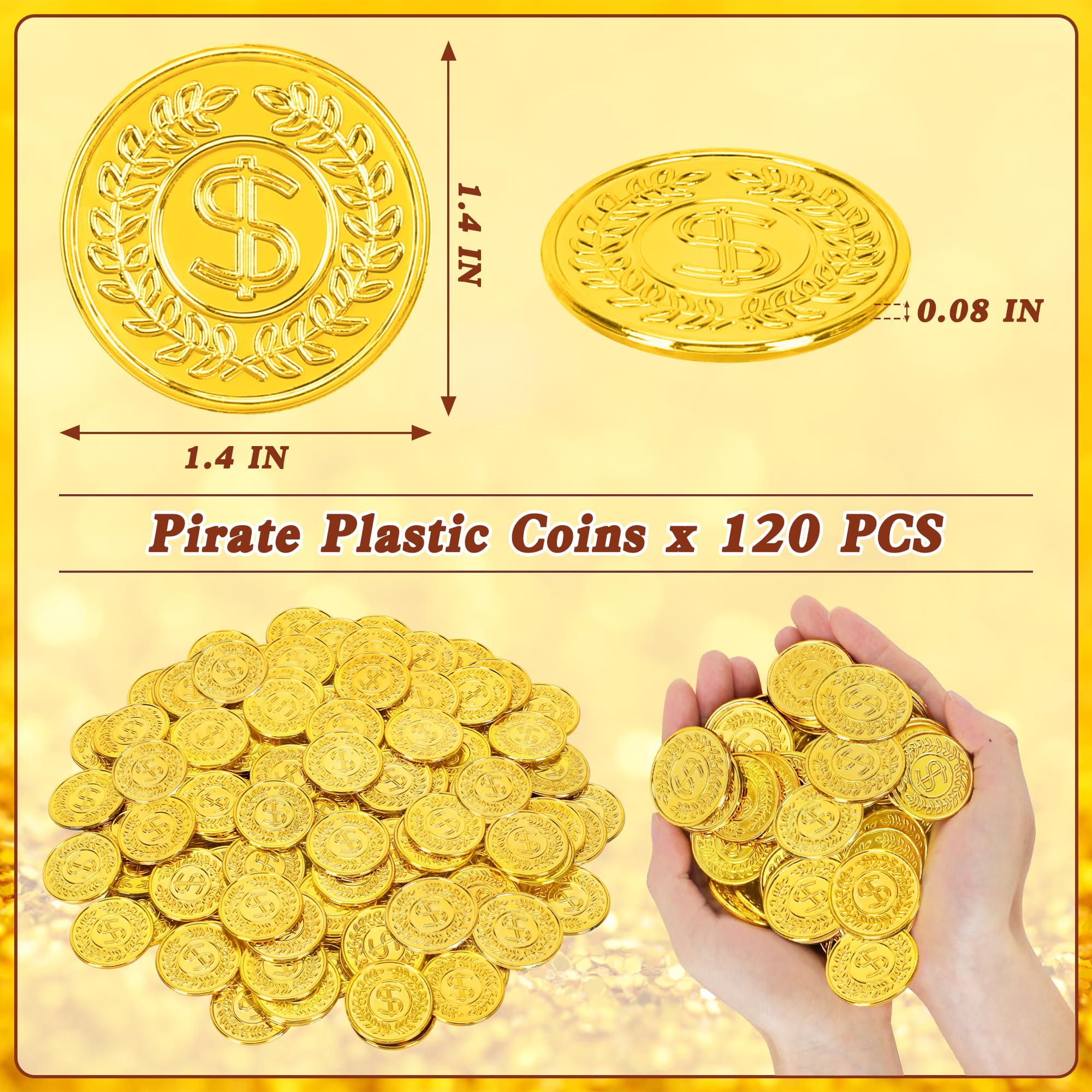 120 PCS Gold Coins, 1.4 in Plastic Gold Coins, 0.08 in Thick Fake Coins Pirate Coins Tokens Play Coins for Kids, Pirate Treasure Classroom Reward Adventure Theme Party Supplies for Pirate Party