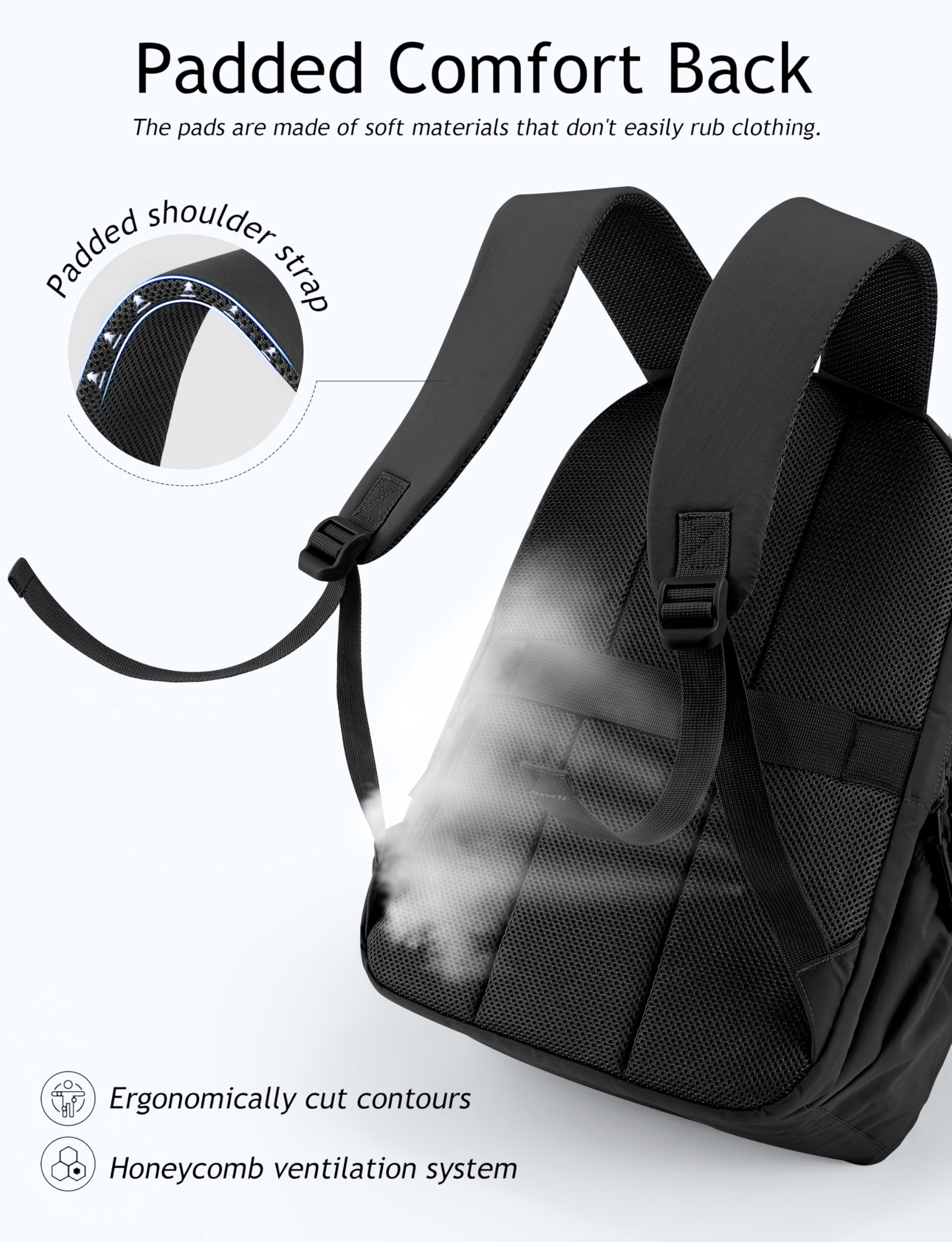 ERGONOMIC SUPPORT FOR YOUR BACK: Mesh-padded shoulder straps relieve the pressure on your shoulders and keep you cool, providing wear comfort. The back luggage strap of the travel backpack is easy to transport with a suitcase.