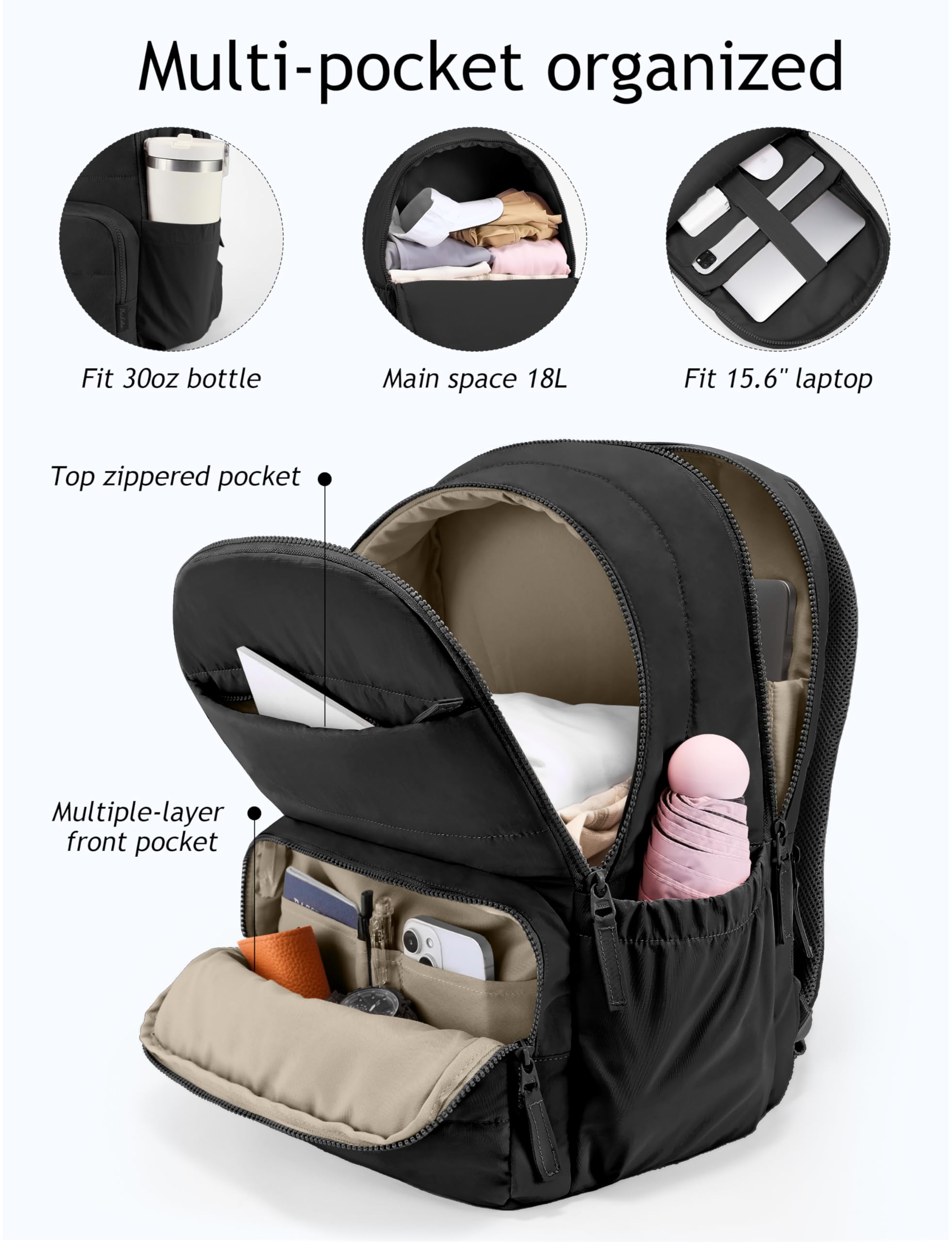 LARGE CAPACITY & DOUBLE ZIPPER: The separate laptop compartment fits up to a 15.6'' laptop, easy to access. Large 18L capacity main space is roomy enough for your college or work essentials such as books, A4 folders, and even clothes for a short trip of 1-2 days. Both have double zippers so you can zip from either side. Dimensions: 16.5×11.4×8.4 inches.
