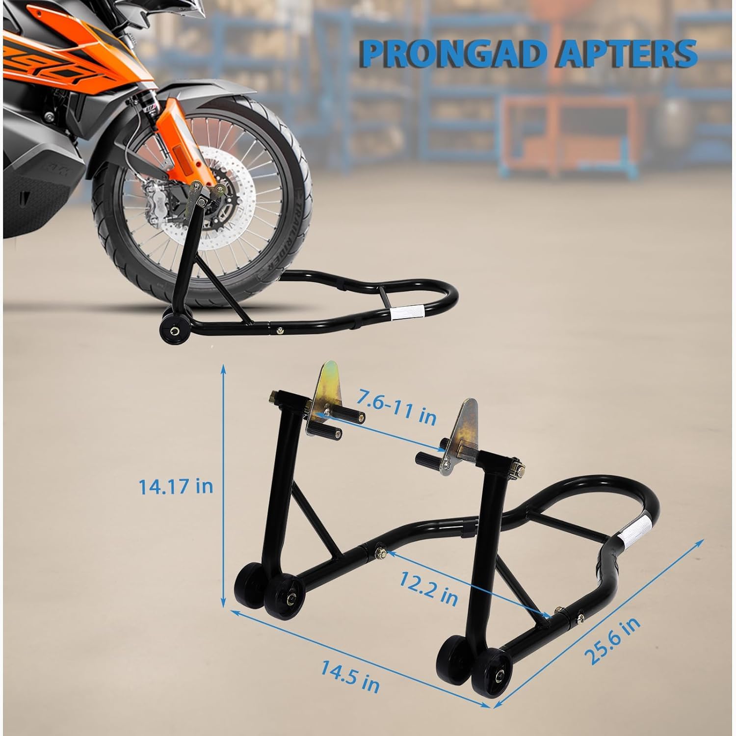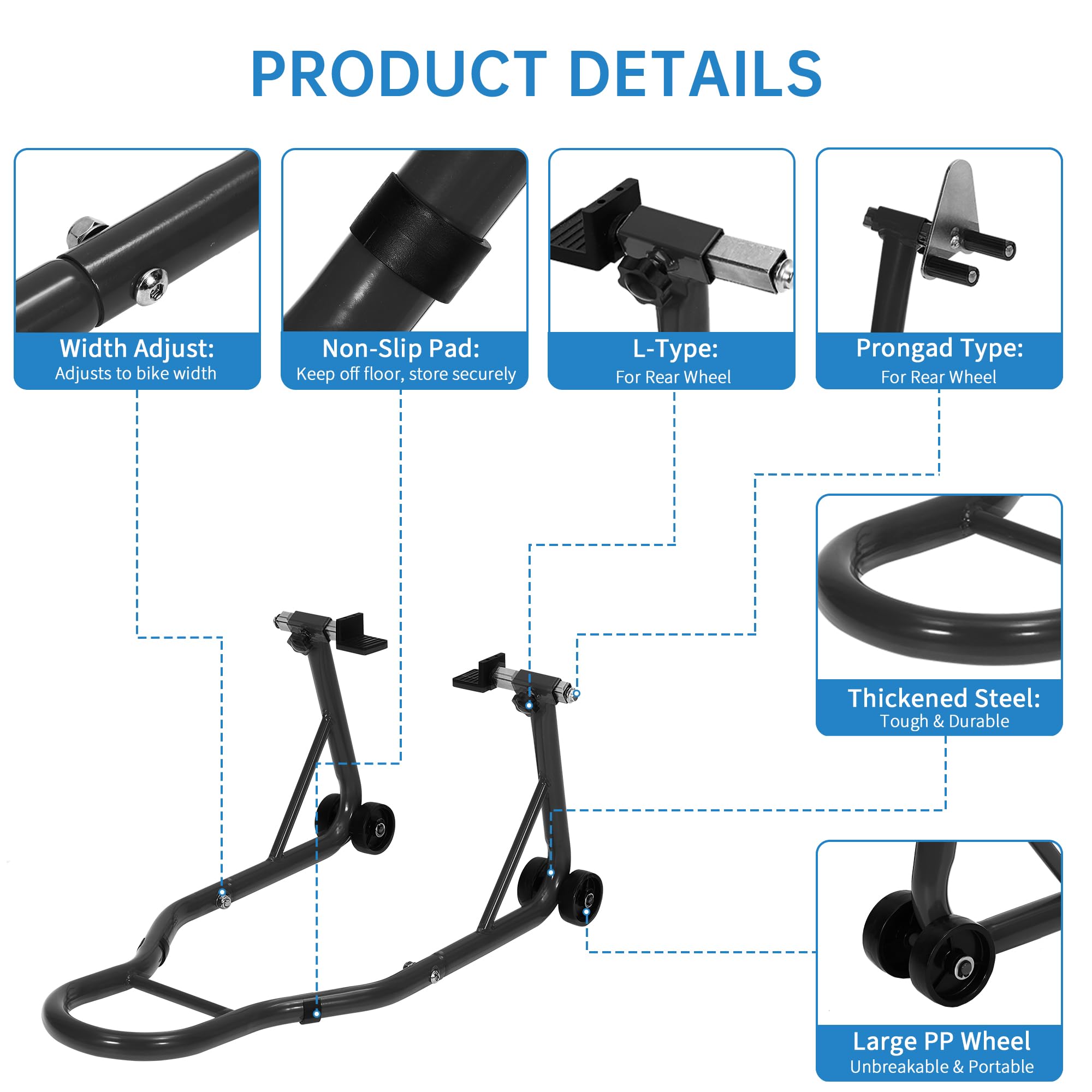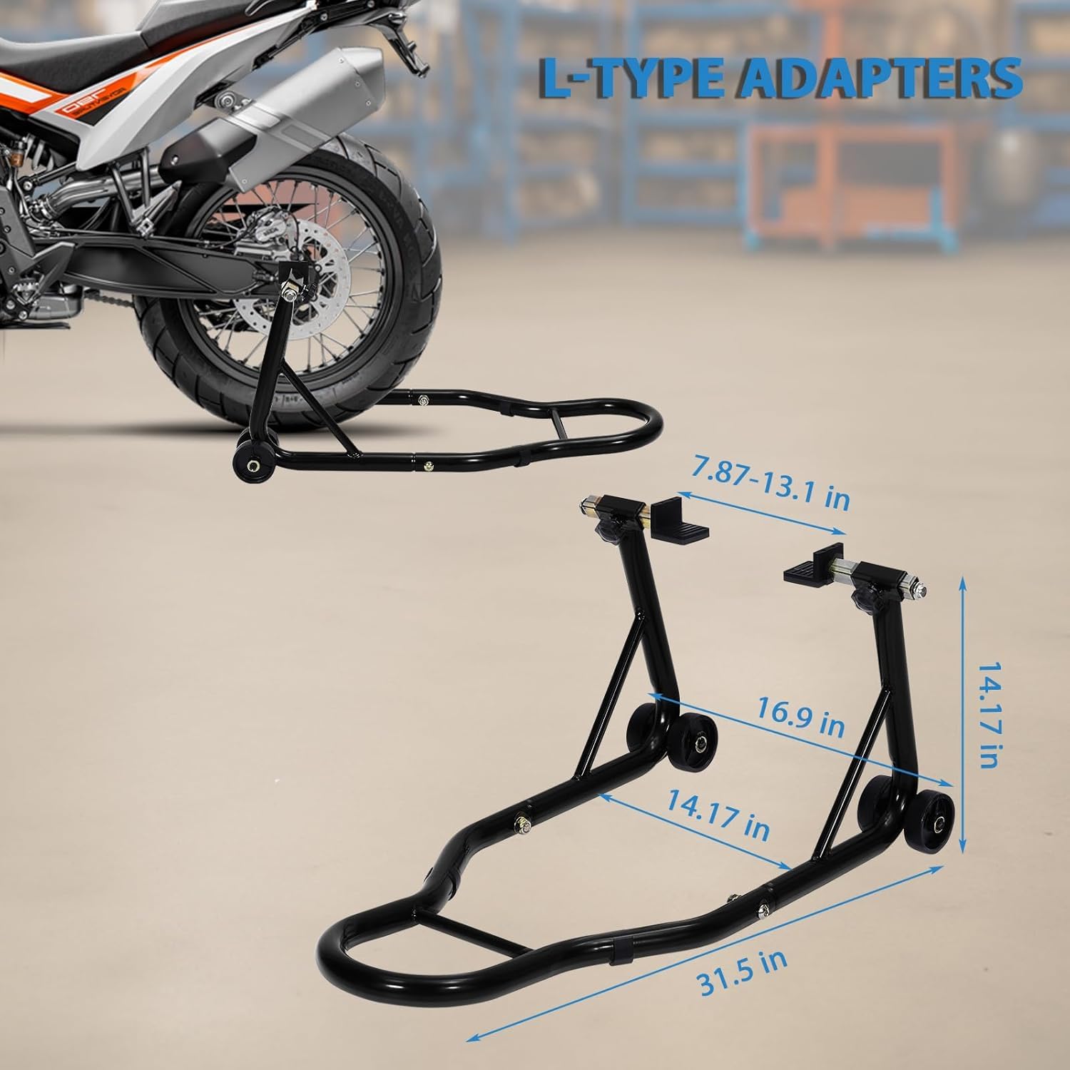 Adjustable Universal Fit: Featuring a front stand adjustable from 7.6" to 11" and a rear stand adjustable from 7.87" to 13.1" (L-shaped fork) or 7.87" to 16.93" (U-shaped fork) with swingarm spools, this motorcycle paddock stand accommodates a wide range of tire sizes