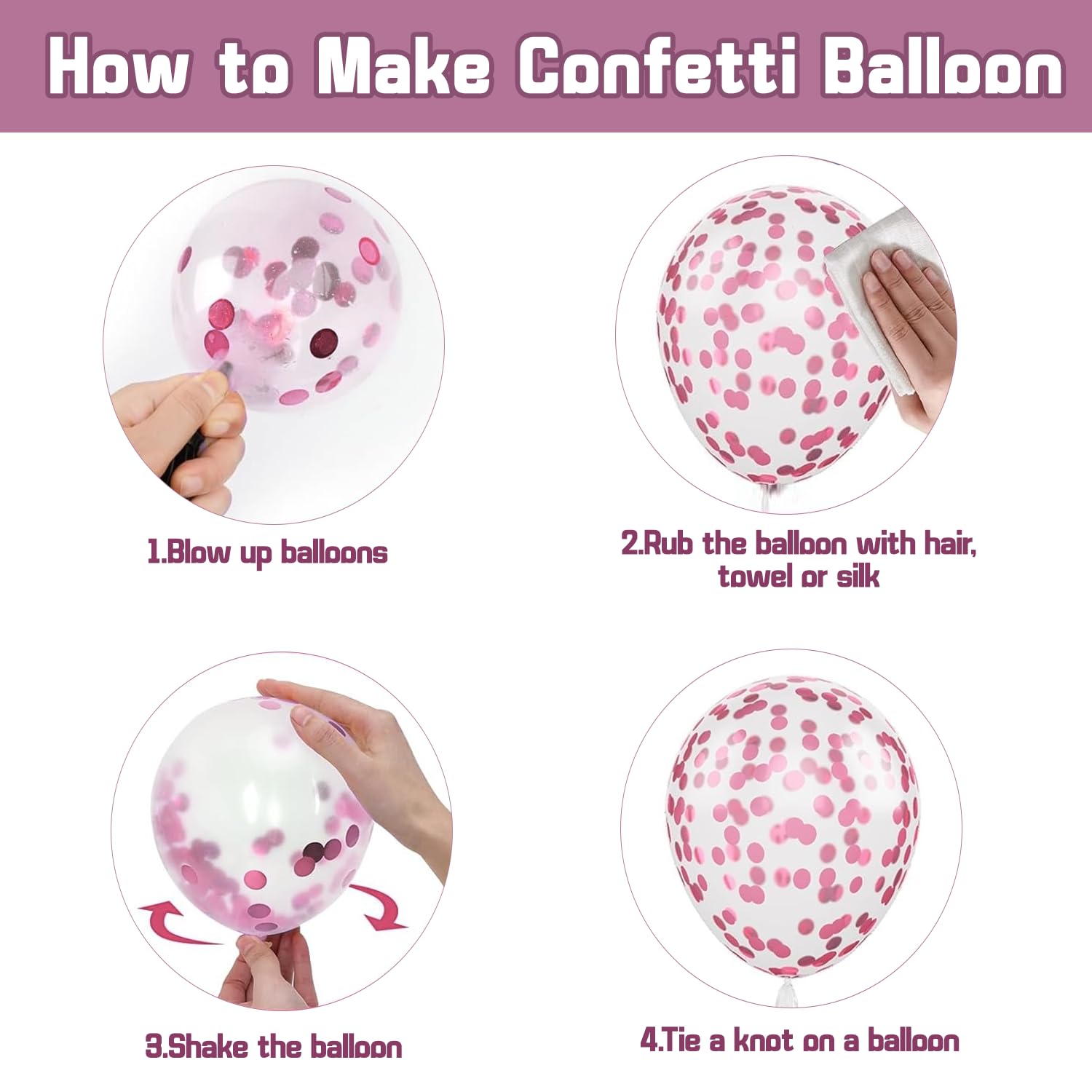 How to use confetti balloons: You just need to inflate the pink confetti balloon first, after it is inflated, rub the balloon on your hair or cloth and shake it, or put the balloon on a dry towel or carpet (silk or wool) and gently rub the balloon, which will help the confetti stick to the side of the balloon and make the pink confetti balloon look more beautiful.