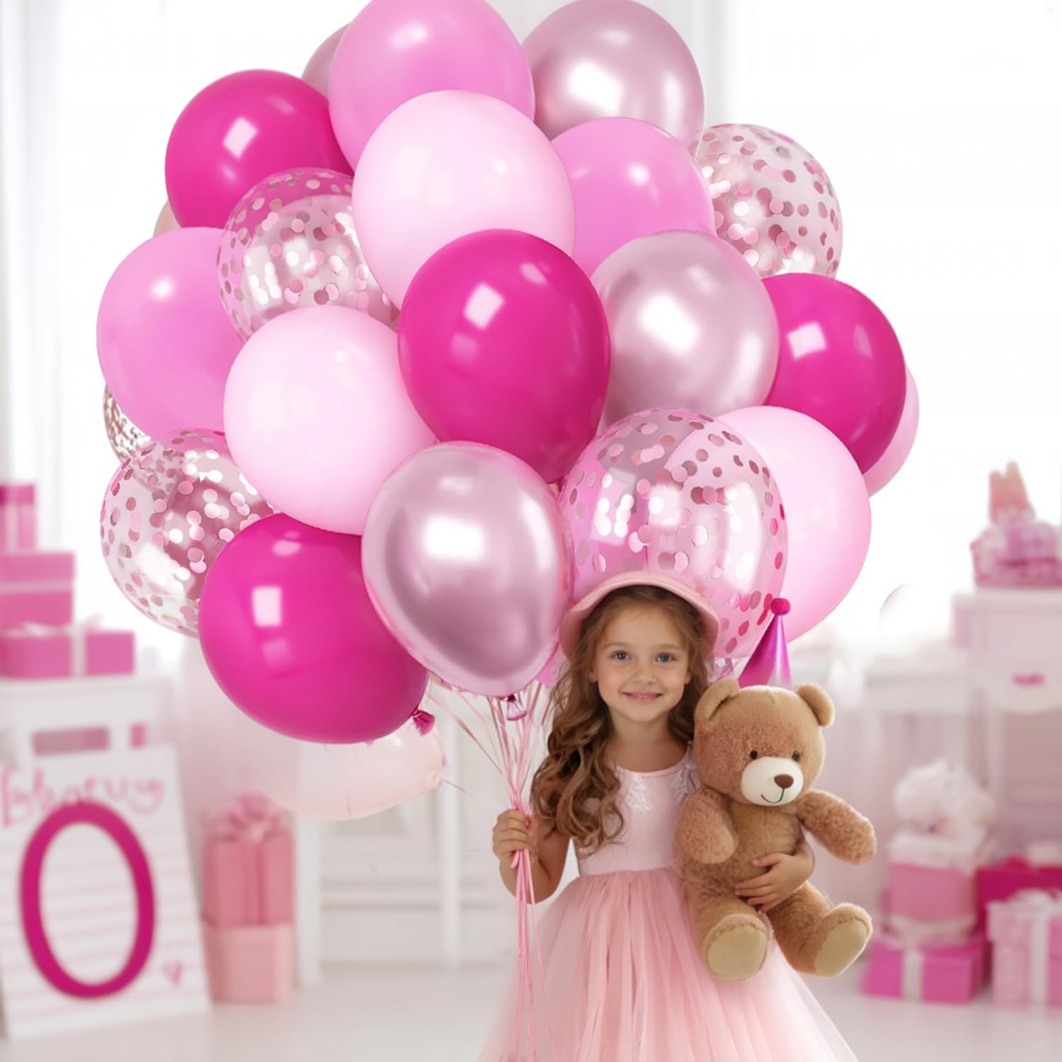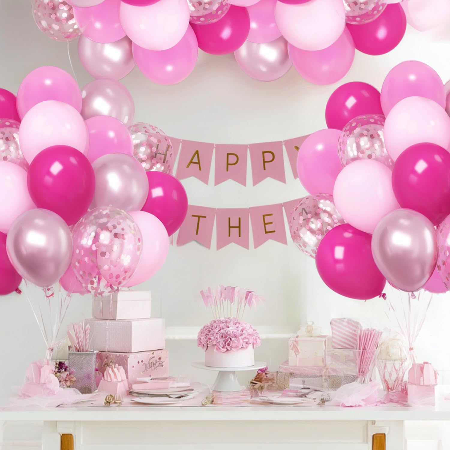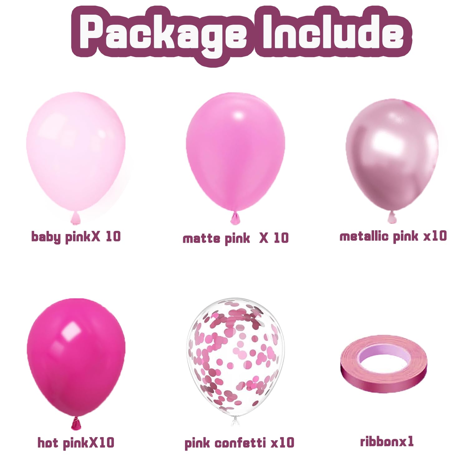 Hot Pink Balloon Set: This is a brightly pink colored set of 50pcs 12inch balloons with different pink balloons. The light pink balloons set including: 10pcs baby pink balloons , 10pcs light pink balloons, 10pcs hot pink balloons, 10pcs metallic pink balloons, 10pcs pink confetti balloons and a roll of pink ribbon.