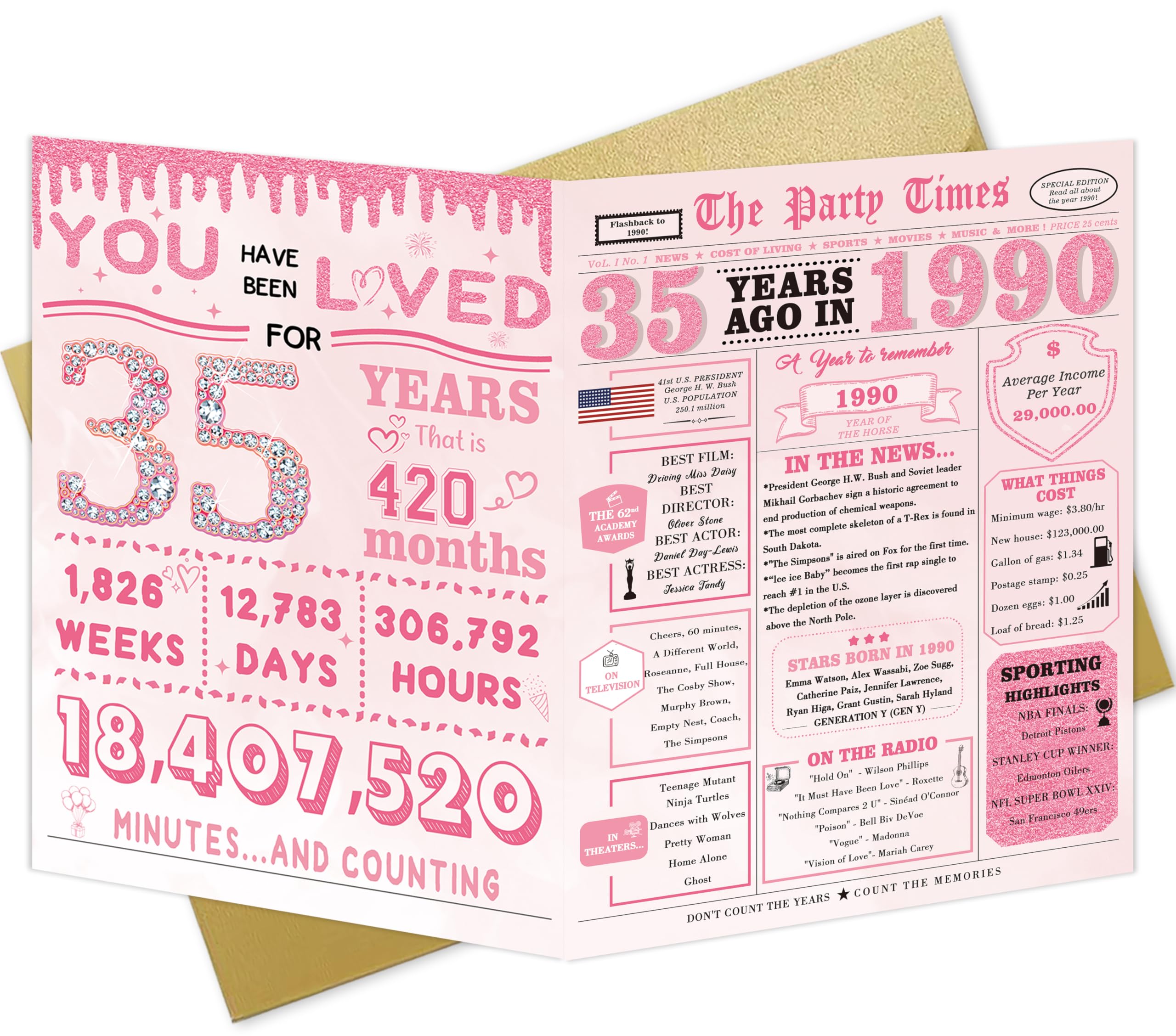 Unique 35th Birthday Card: Make her milestone birthday unforgettable with this unique card designed to celebrate 35 wonderful years of life, love, and memories. The pink and sparkly theme with glamorous font and glitter accents makes it an ideal birthday card for women turning 35. Whether it's for a best friend, sister, or daughter, this card offers the perfect blend of humor, nostalgia, and heartfelt sentiment for her special day.