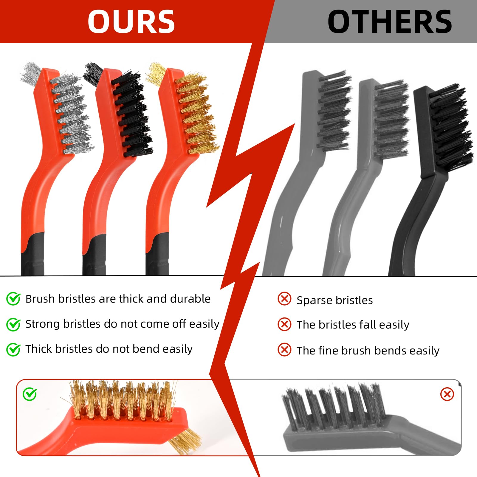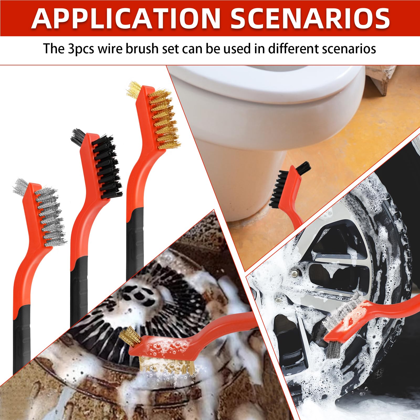 3pcs Wire Brush Set: Wire brush set includes stainless steel brush, nylon bristles and brass brush. These will be good for tackling most light duty jobs at hand particularly those requiring reaching small spaces