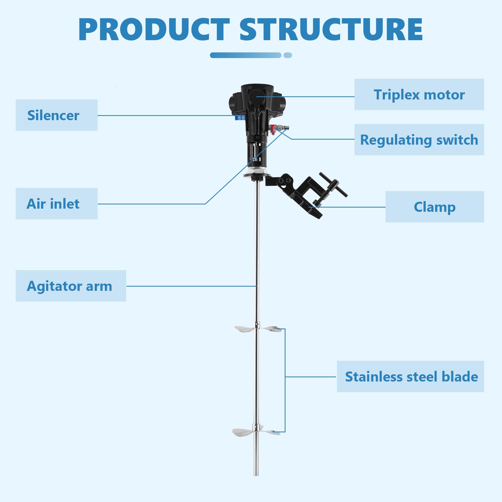 【Parameters】:Motor: Pneumatic; Mixing capacity: 50 Gallon /200L Tank; Power: 1/2 Horsepower; Blade material: stainless steel; Weight: 20lbs.