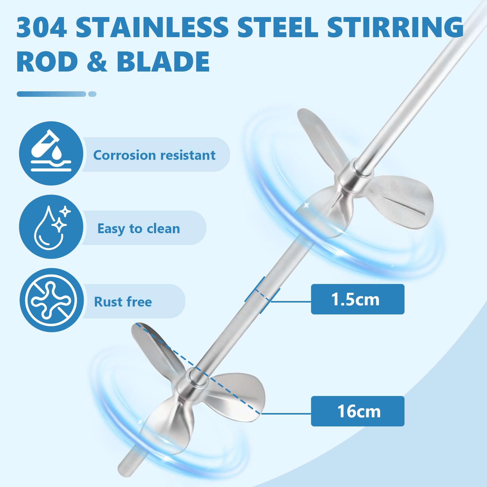 【Stainless steel rod & blade】:This air mixer comes with the 304 stainless steel stirring rod and blade, which is durable and not easy to rust.