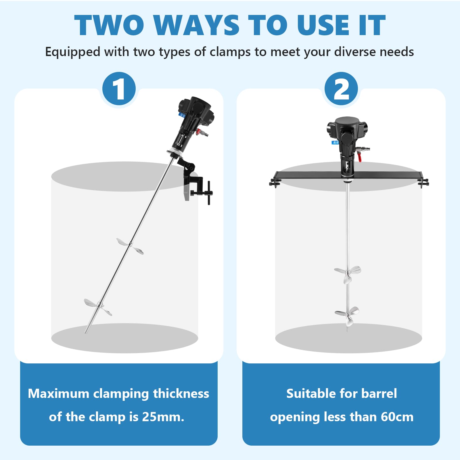 【Two clamps】:This pneumatic paint mixer comes with two clamps, one is horizontal and another is vertical, so that it could be used with two methods. When using this mixer with the horizontal clamp, please note the diameter of your should not exceed 60cm. The maximum clamping thickness of the vertical clamp is 25mm.