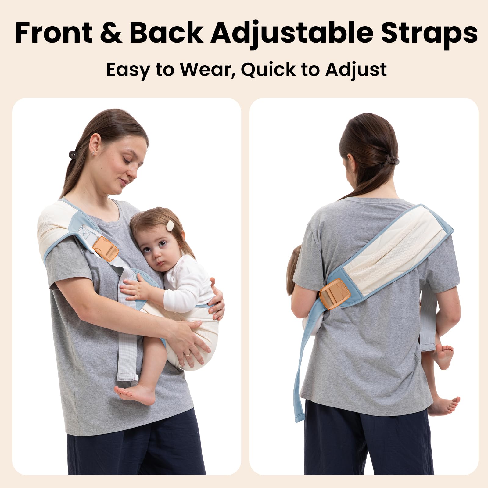 【Adjustable & Ergonomic Fit】This toddler sling carrier features dual front and back adjustable straps, offering a perfect fit for all body types, including plus-size parents. Its ergonomic M-shaped seat supports healthy hip development, making it ideal for long-term use from newborn to toddler.