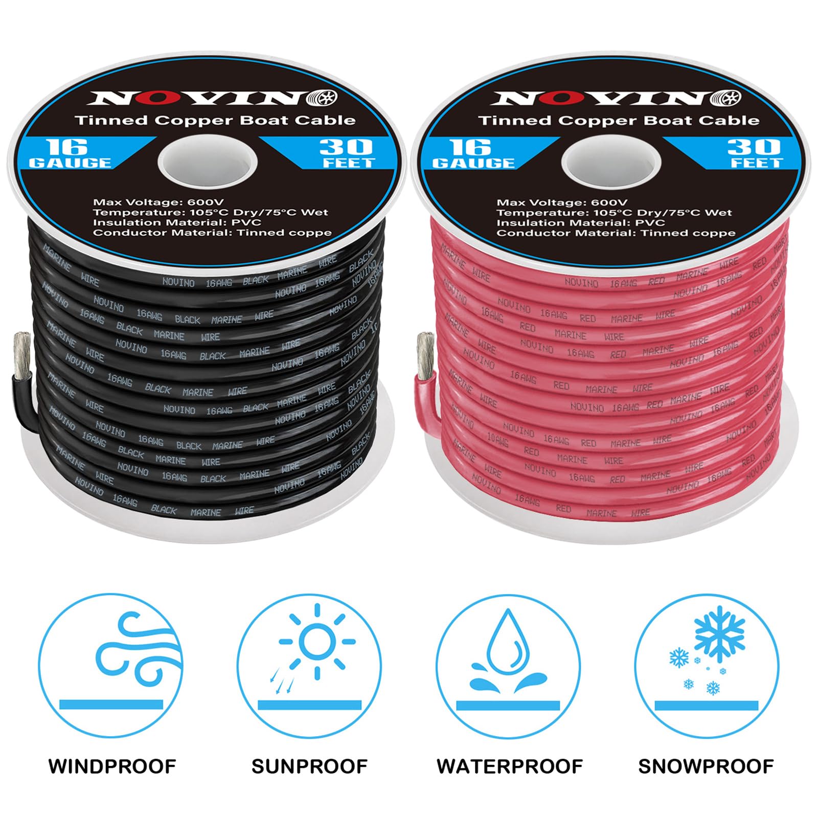 Boat Wire Cable Spec:Red&black conductor sheaths, tinned & stranded True 16 AWG copper wire,16 awg wire is insulation rated to 600v, 105 degrees C dry, and 75 degrees C wet