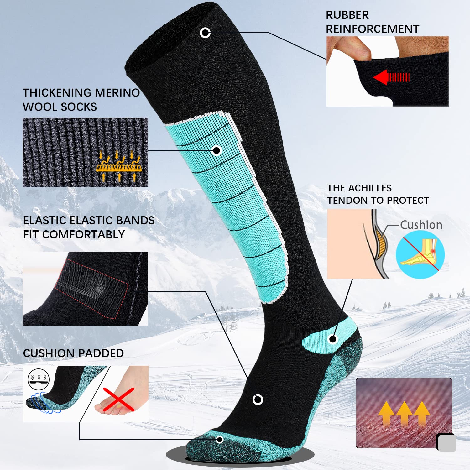 SOFT & COMFORTABLE: These thick-knee high socks feature thick terry loop in forefoot, heel, and toe specifically engineered for minimized friction and shock absorption. The snowboard socks added just the right amount of targeted padding on the front shin area where skiers and riders often need a little more cushion. This ski accessories are great options for skiers and riders who know a great day on the mountain starts with a great pair of socks