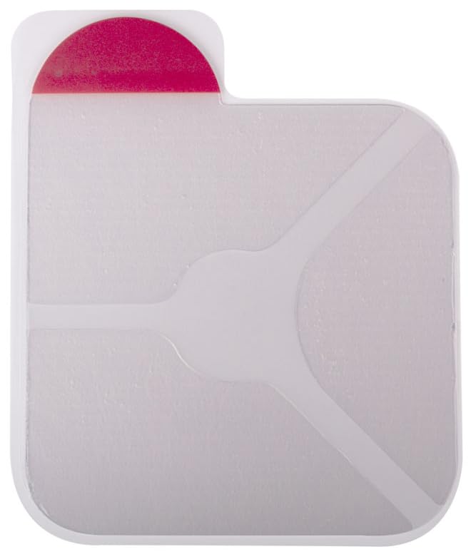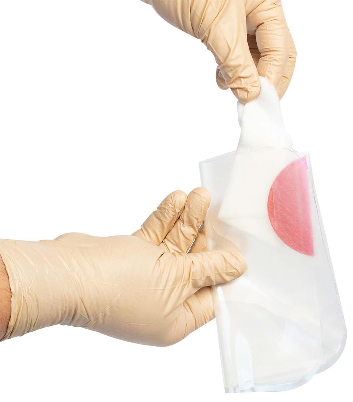 Easy-to-grip, large red tab for single step, peel-and-apply application that allows for the burping of the wound if necessary