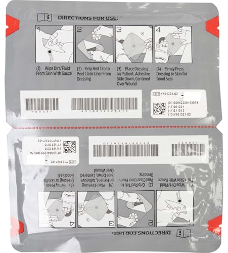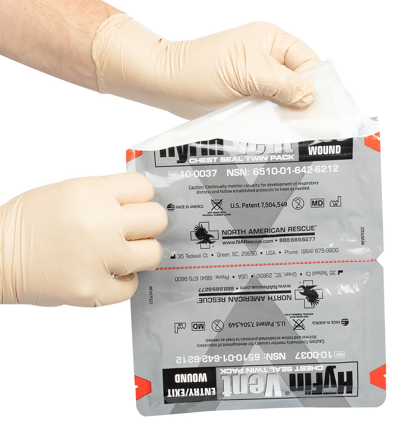 The HyFin Vent Chest Seal Twin Pack from North American Rescue sets the standard for the prevention, management and treatment of an open and/or tension pneumothorax potentially caused by a penetrating chest trauma. Two seals, each individually packaged, are designed to allow the user to apply a seal to both an entry or an exit wound while also giving the option to only apply one and store the other until needed as the situation requires. This innovative design provides 3-vented channels designed to prevent airflow into the chest cavity during inhalation while allowing air to escape through the vent channels during exhalation. The 3-vent channels are designed to allow blood to escape and also provide a backup fail-safe system, as even if two of the three channels become obstructed, the vent is designed to remain fully operational. Advanced adhesive technology provides superior adhesion as specifically designed to overcome adverse conditions in austere environments where the casualty may be covered in blood, sweat, body hair, or other environmental contaminants when a reliable chest seal is mandatory. Packaged in a more compact, rugged, easy-to-open twin foil pouch, each chest seal also includes a gauze pad to wipe the wound surface prior to application. Has a large red pull tab for single-step peel-and-apply application, while the transparent backing facilitates easy placement over the wound area, conforming to the patient’s chest.