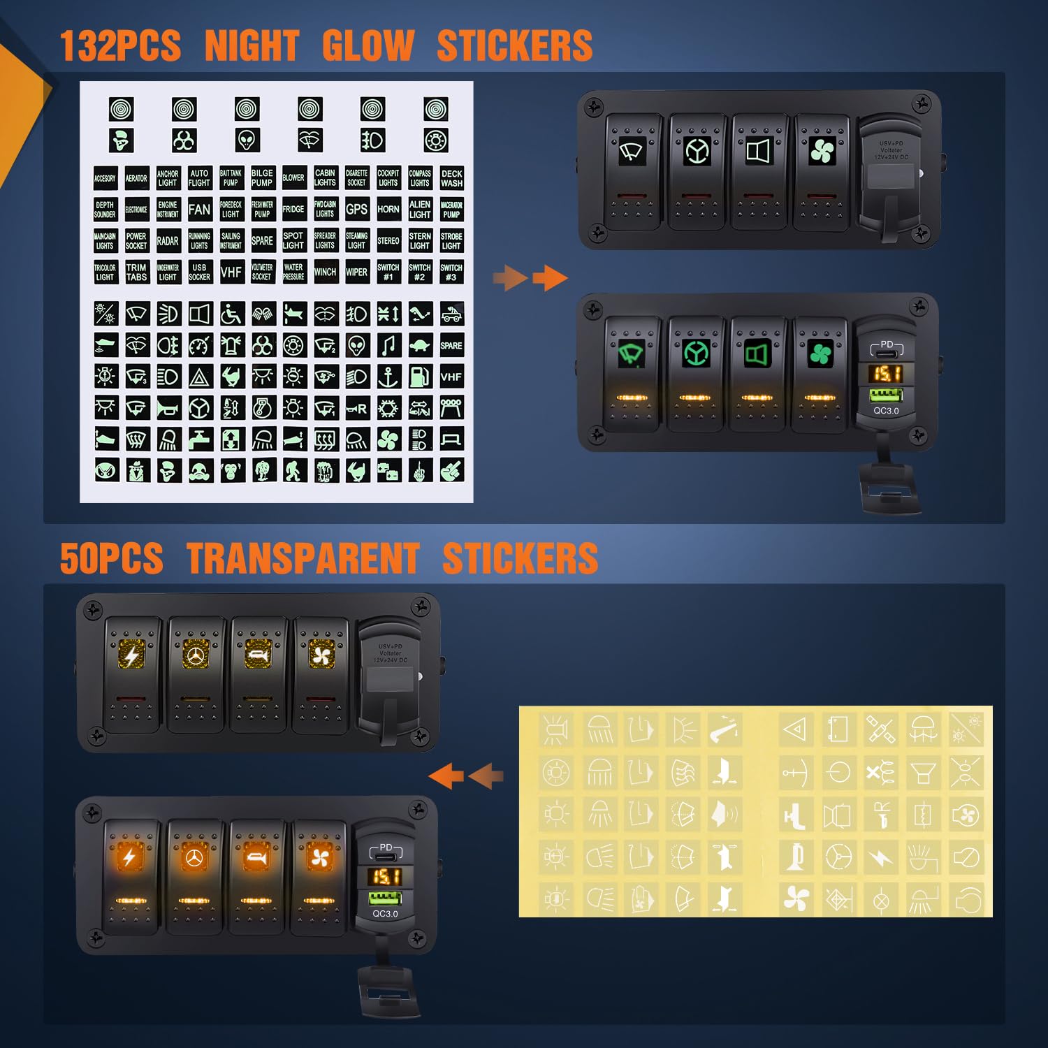 Wide Application: The switches allows you to control up to 4 different devices, such as Led Light Bars, Rear Lights, Rock Lights, Windshield Lights, Off road Lights, Sasquatch Lights, Zombie lights and Wench power, etc. The complimentary transparent and night glow stickers enables you to DIY the switch according to your preference. Package Includes: 4 Gang pre-wired switch box with USB charger and voltmeter, 1X transparent sticker,1X night glow sticker, mounting screws