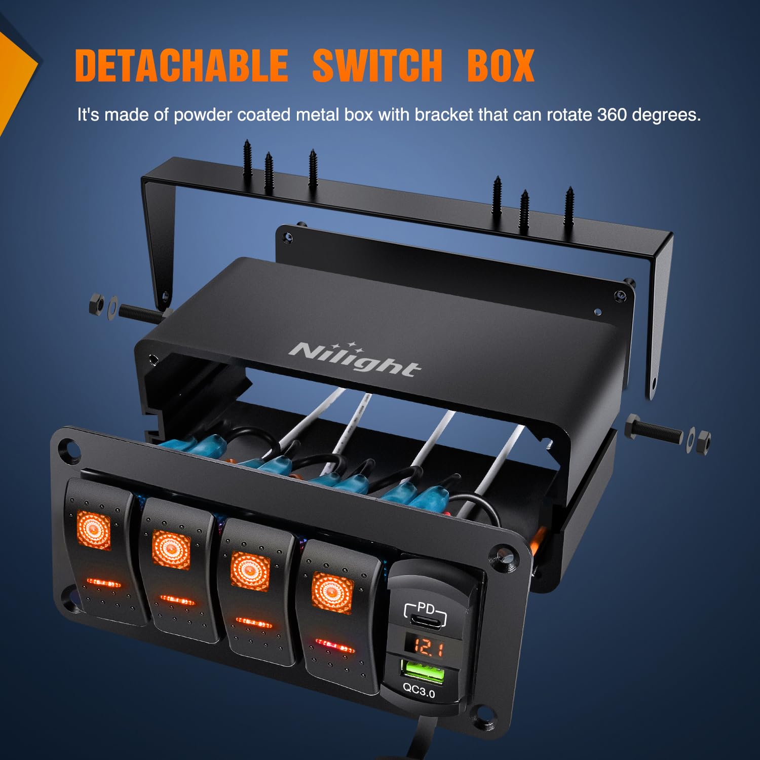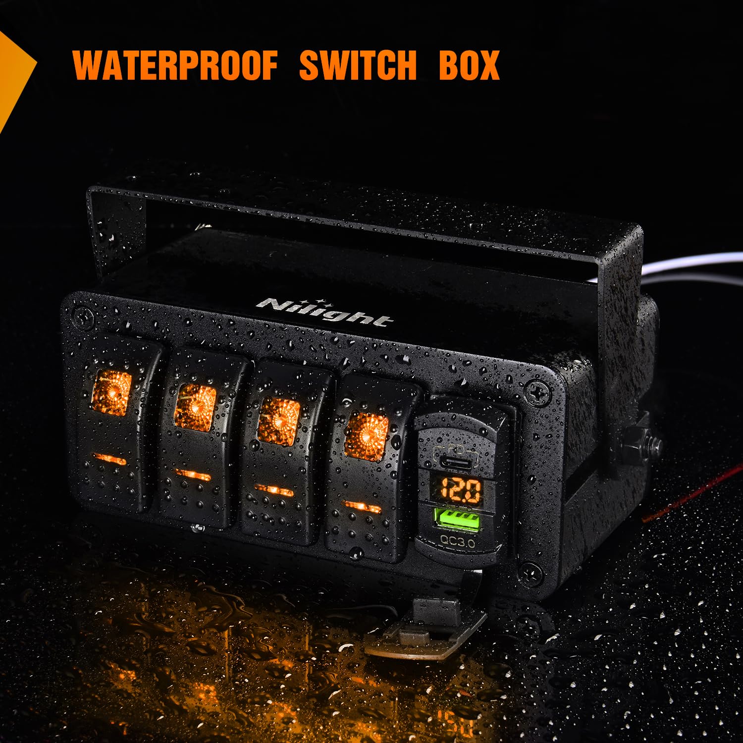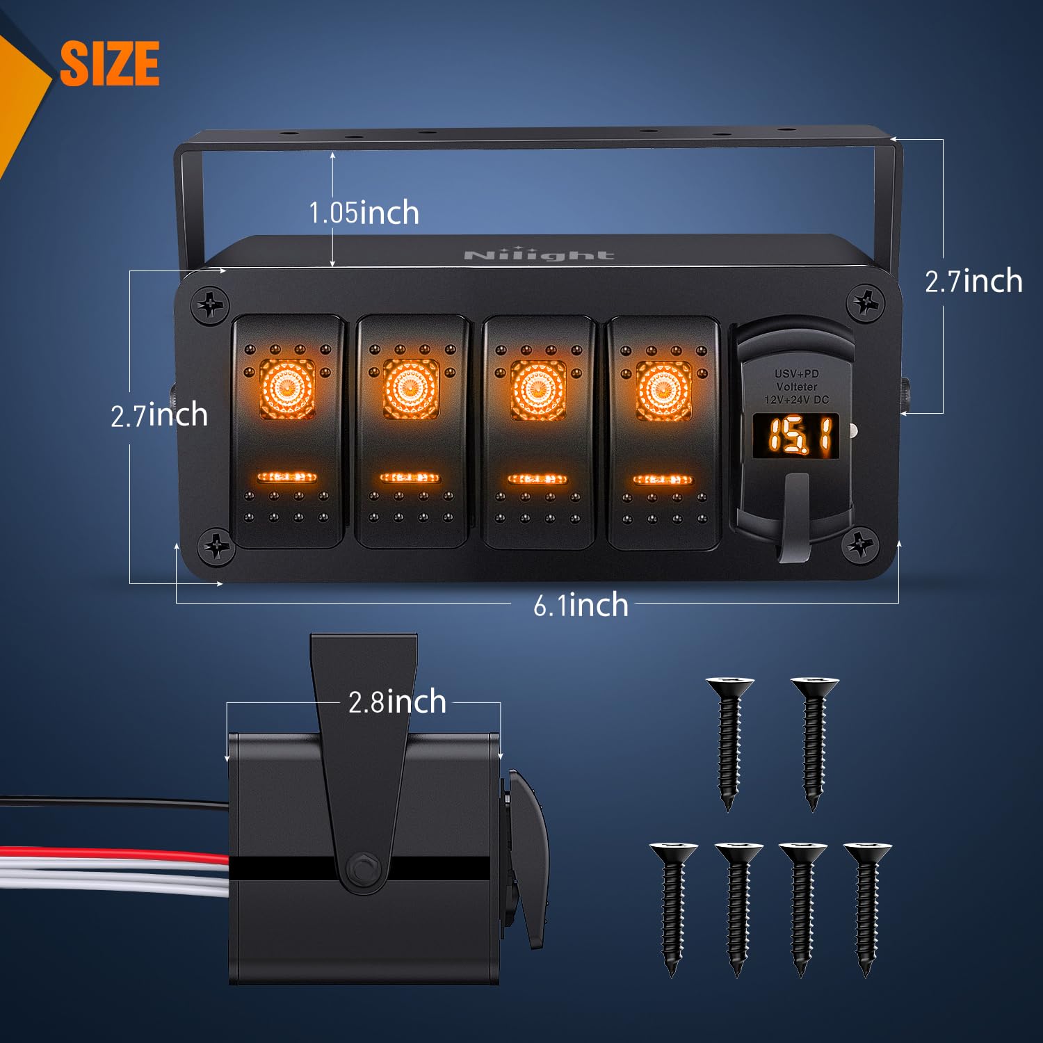 Multi-Function designed: This switch box is integrated with 4pcs 20 amps Rocker switches rated at 12VDC and a QC3.0 dual USB charger with LED voltmeter. Suitable for most 12V-24V DC cars, UTVs/ATVs, trucks, trailers, RVs, caravans, buses, marine boats, yachts etc