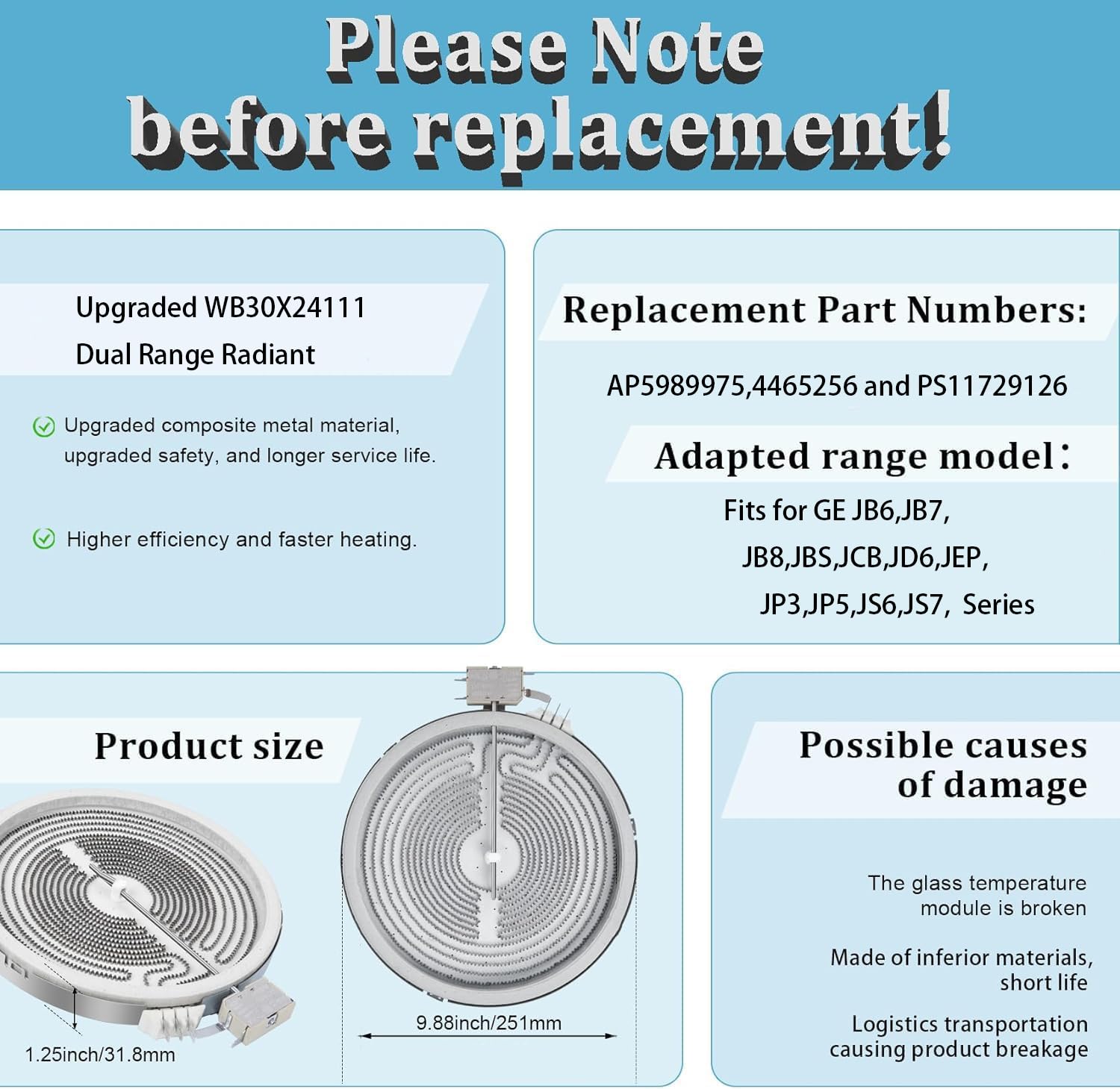 【 Stronger heating 】Upgrade WB30X24111 Replace for GE glass cooktop replacement : WB30X24111 haliant surface element dual radiation range, and the heating increased, resulting in higher efficiency and faster heating.