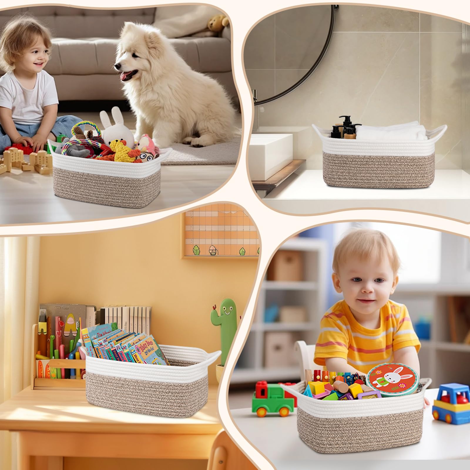 Multi functional storage: The woven basket has multiple practical functions and can store daily small items such as books, diapers, keys, fruits, snacks, etc. It can be used as a children's toy basket, dog toy basket, toiletries basket, shelf basket, or desktop organizing basket. It has a wide range of applicability and can be easily integrated into various home spaces, such as living rooms, bedrooms, children's rooms, washbasins, etc
