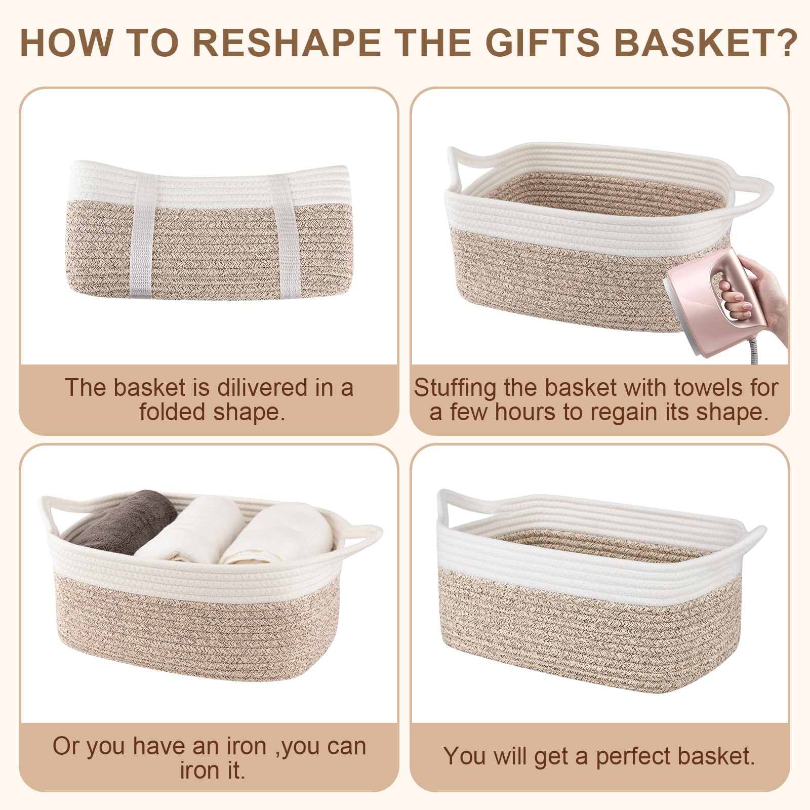 Convenient recovery process: The small baskets for gifts is folded when arriving. After receiving the basket, you can easily open it and place towels or clothes to regain its shape. If you have an iron at home, ironing can also help the cute storage basket recover to its best condition faster