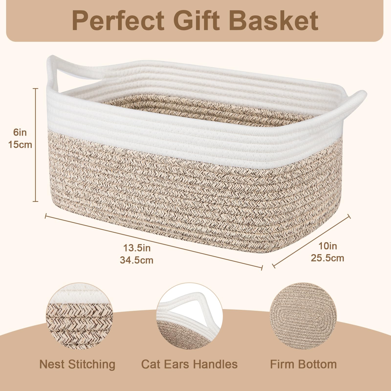 Safe Material: The basket is 13.5*10*6in and made of 100% pure cotton material, no chemical material, no odor, soft and skin friendly. It is no sharp edges that may scratch the floor, especially suitable for children and pets.We are passionate about providing you and your family with a healthy and clean home atmosphere