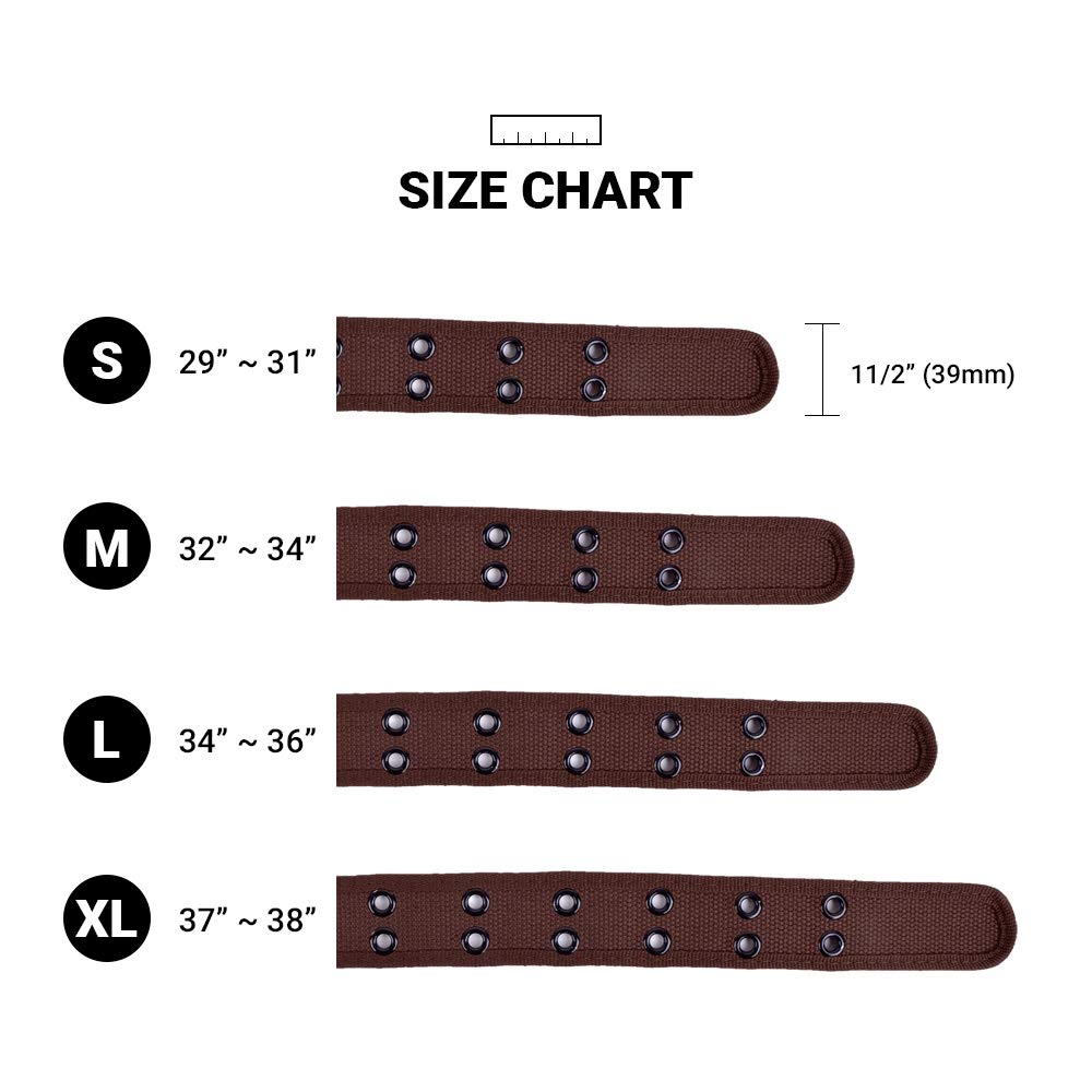 ● SIZES: The Canvas Double Grommet Belt is available in 4 sizes to fit every body type. S: 29"-31" waist; M: 32"-34" waist; L: 34"-36" waist; XL: 37"-38" waist. Wide: 1.5"