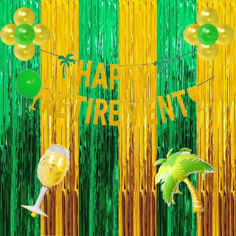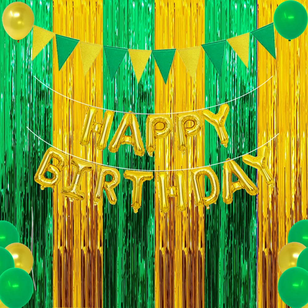 Green and Gold Birthday Party decorations: It is made of high quality aluminium foil, green and gold 2 colors, 3 Pack, size 3.2 x 6.5ft. The material it's easy to not tangle because of the way its neatly packaged.