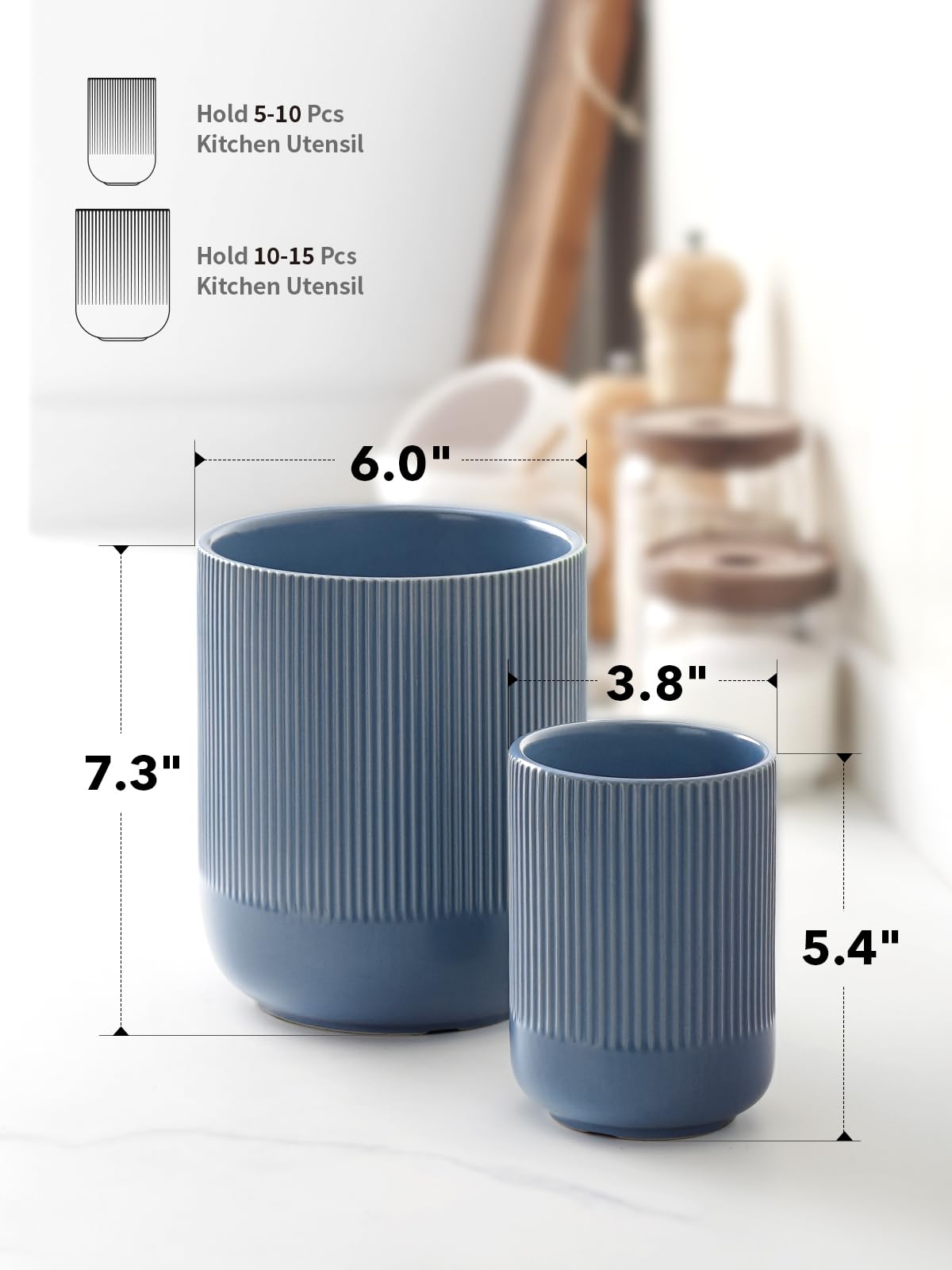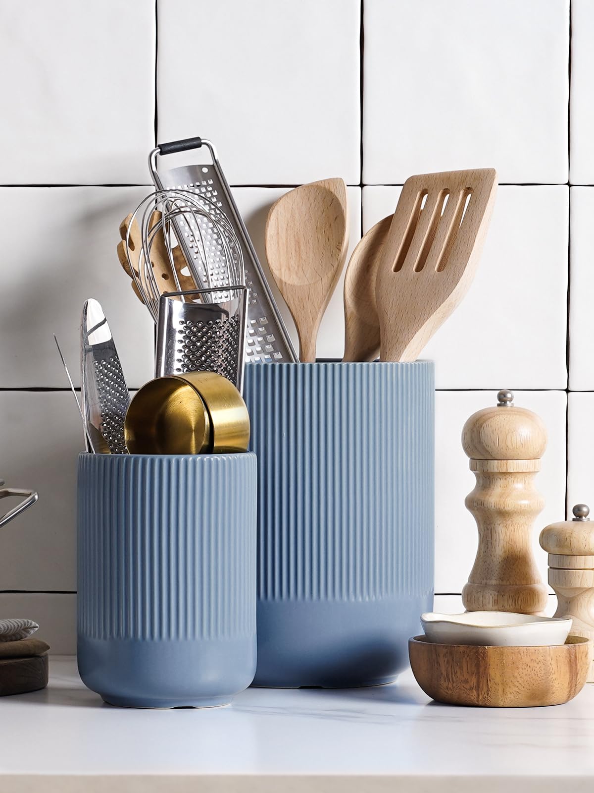 Thoughtfully Sized, Set of 2: Our utensil holder set includes 2 carefully proportioned holders for your kitchen accessories; The larger holder, measuring H7.3" x D6", is designed to comfortably store around 15 spatulas or utensils; The smaller holder, at H5.4" x D3.8", is suited for the organized arrangement of up to 10 sets of flatware; Say hello to a well-organized cooking space