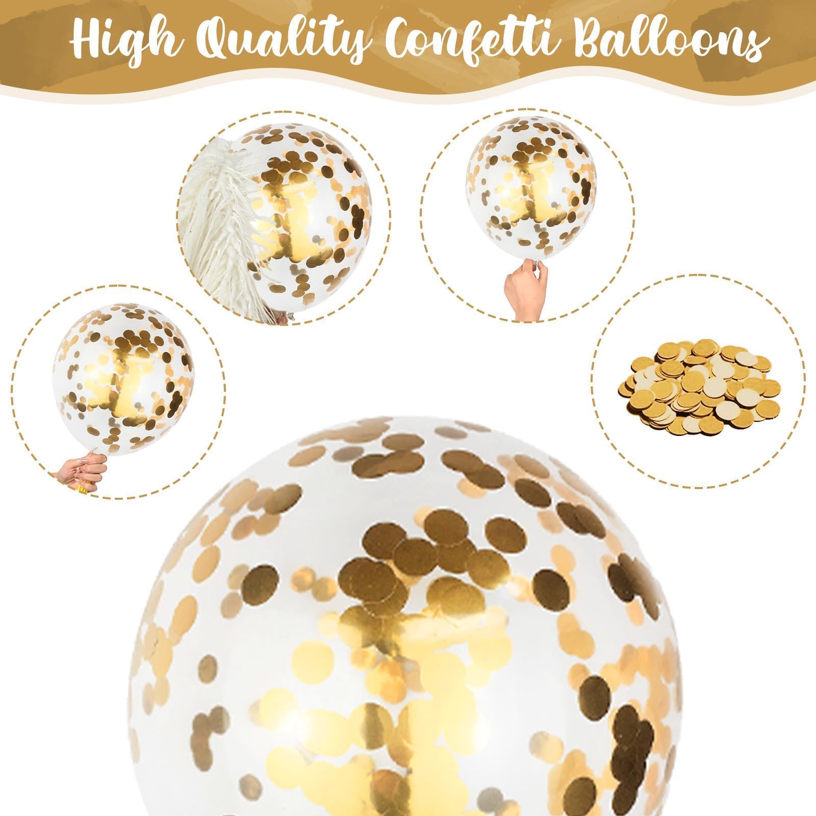 🎉 Easy to Use - The gold and white balloons support both air and helium. You can blow them up with a mouth, pump or helium. After inflating, shake the confetti balloon and gently rub it with your hair or dry fabric to make the confetti stick to the side of the balloon, which can make the balloon look more beautiful. When the party is over, you can pop the balloons to let the confetti fall, adding fun to the party.