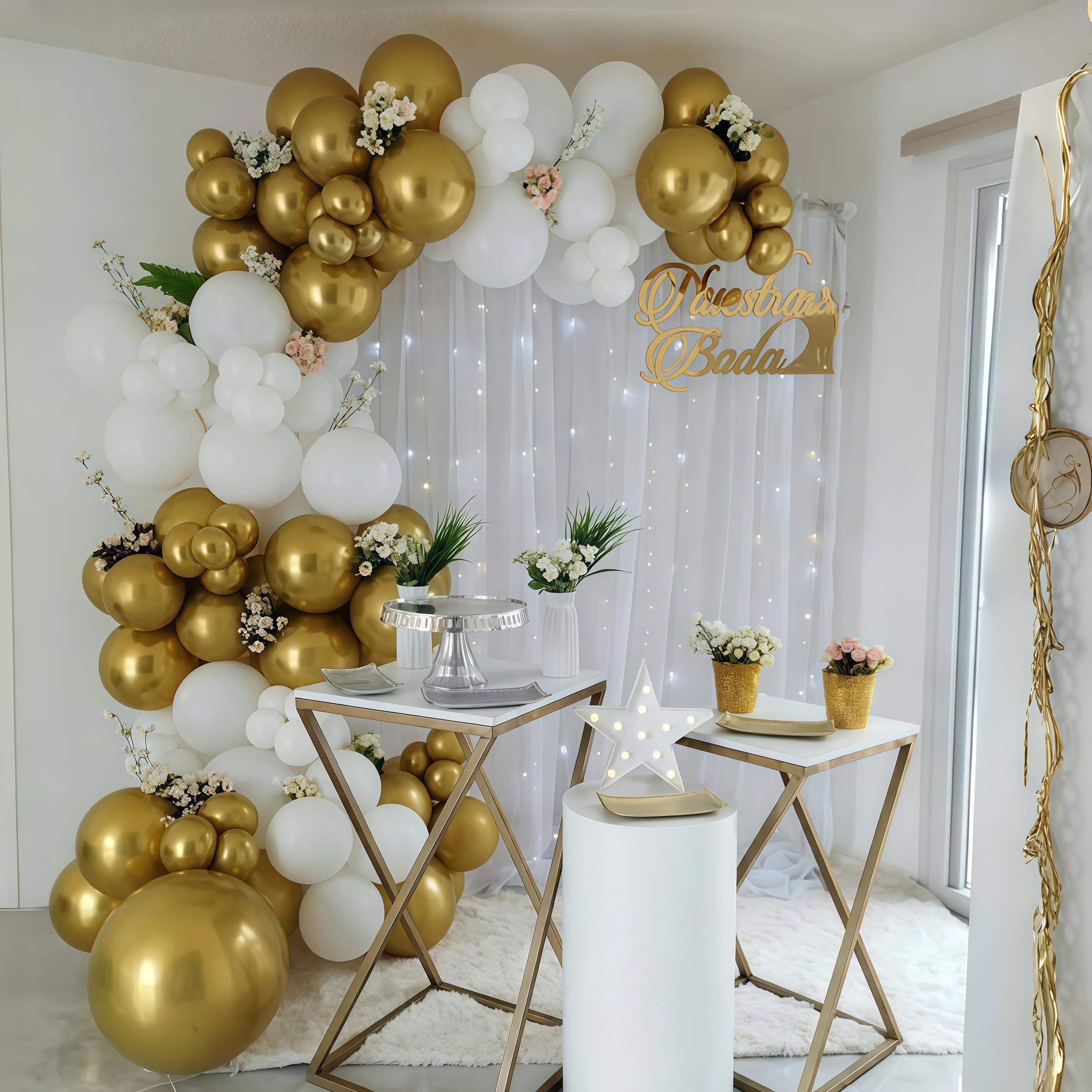 🎉 Premium & Durable Material - The white gold confetti balloon kit is made of high quality 100% natural latex, thick thick and long-lasting, not easy to burst, every balloon has been rigorously tested and selected manually, safe for children. They can be filled with air or helium, suggested use with a balloon pump.