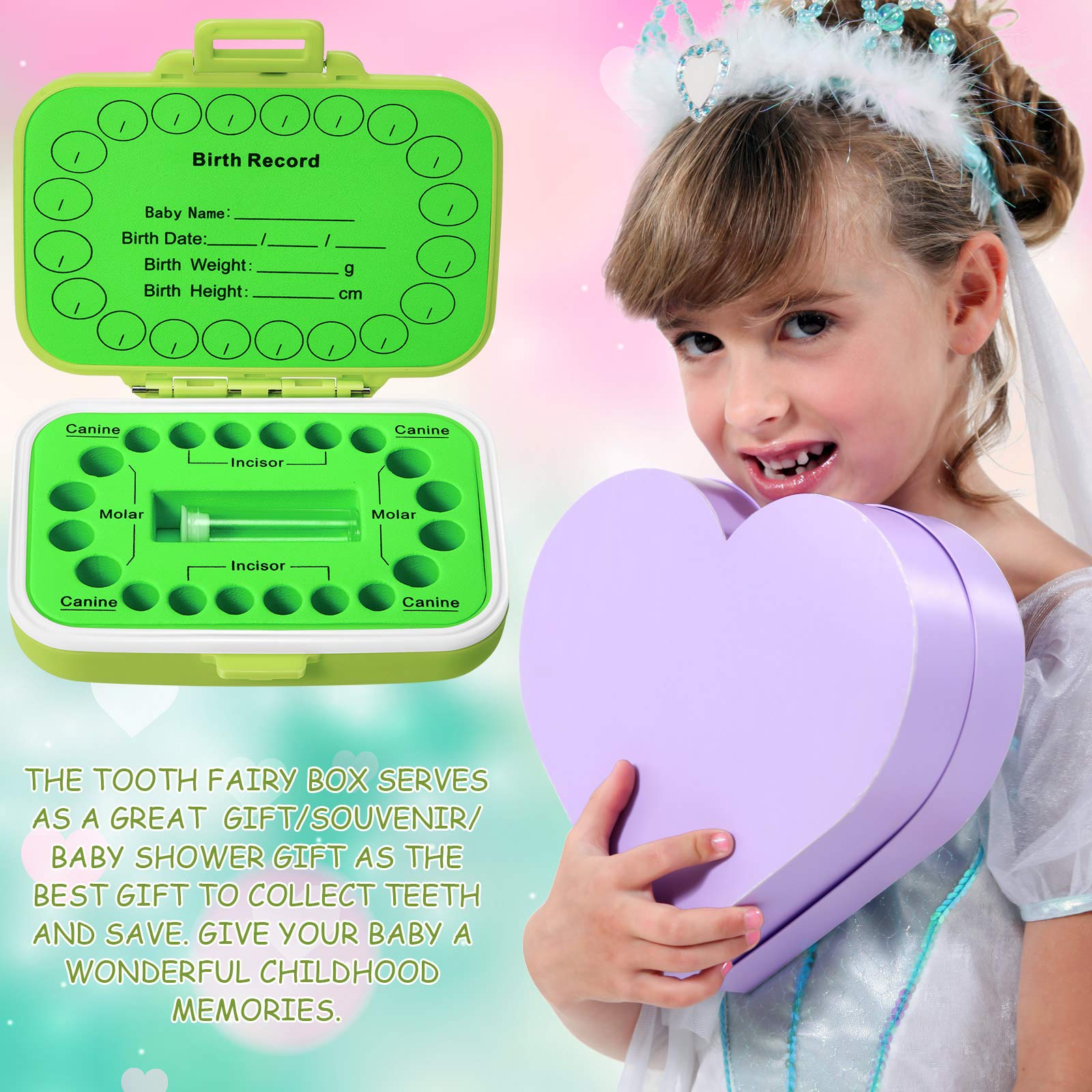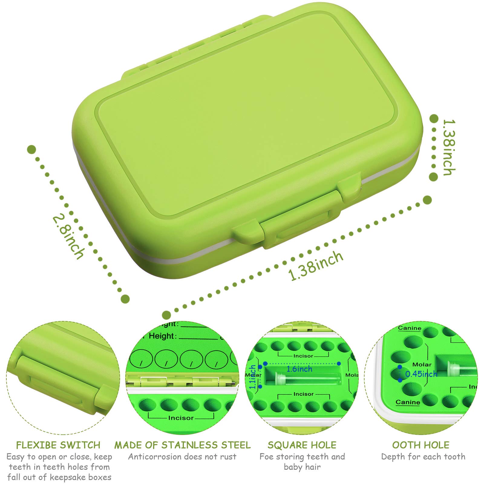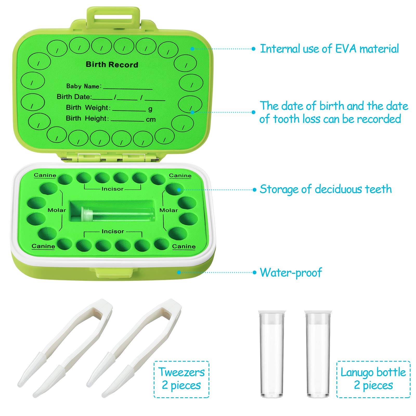 A complete set: you will get 2 pieces of baby teeth keepsake box in green and blue, each box comes with 1 piece of tweezers and 1 glass bottle to contain fetal hair; This complete set allows you to give your baby a complete childhood memory and save it forever