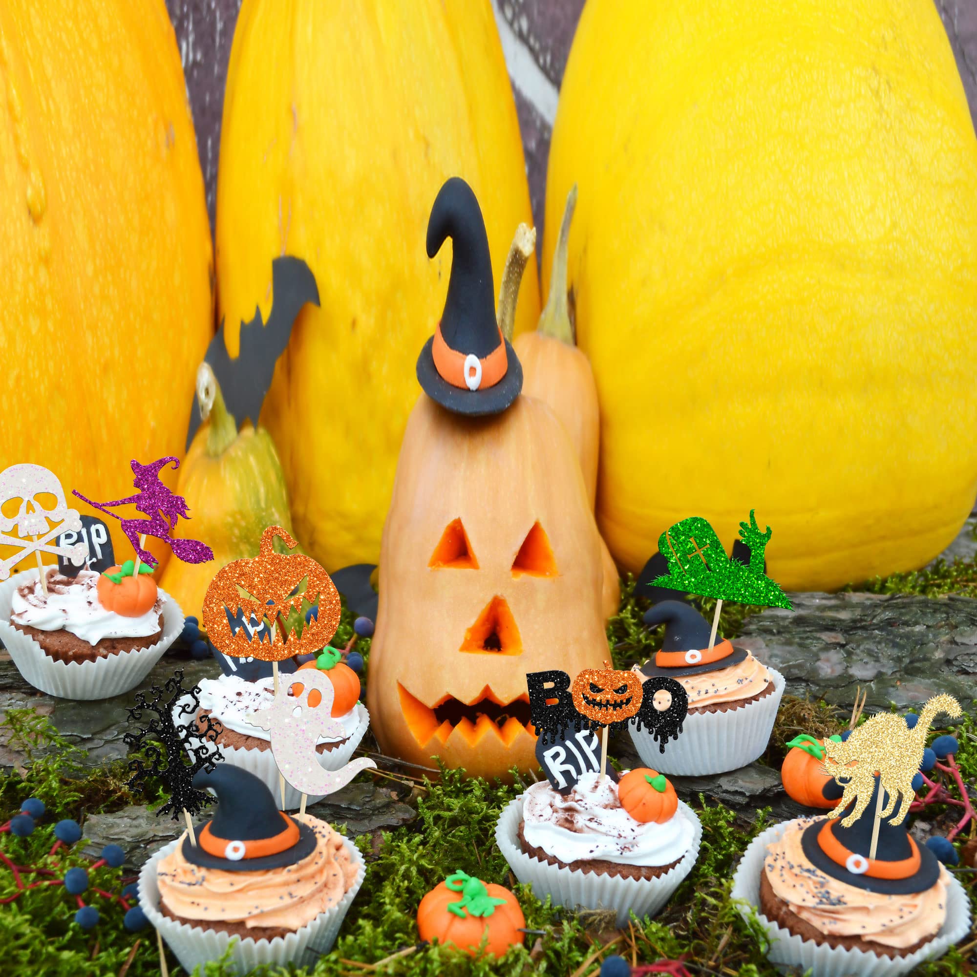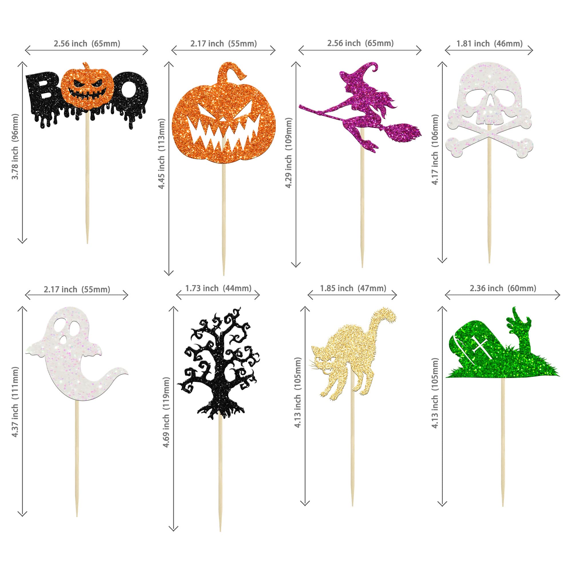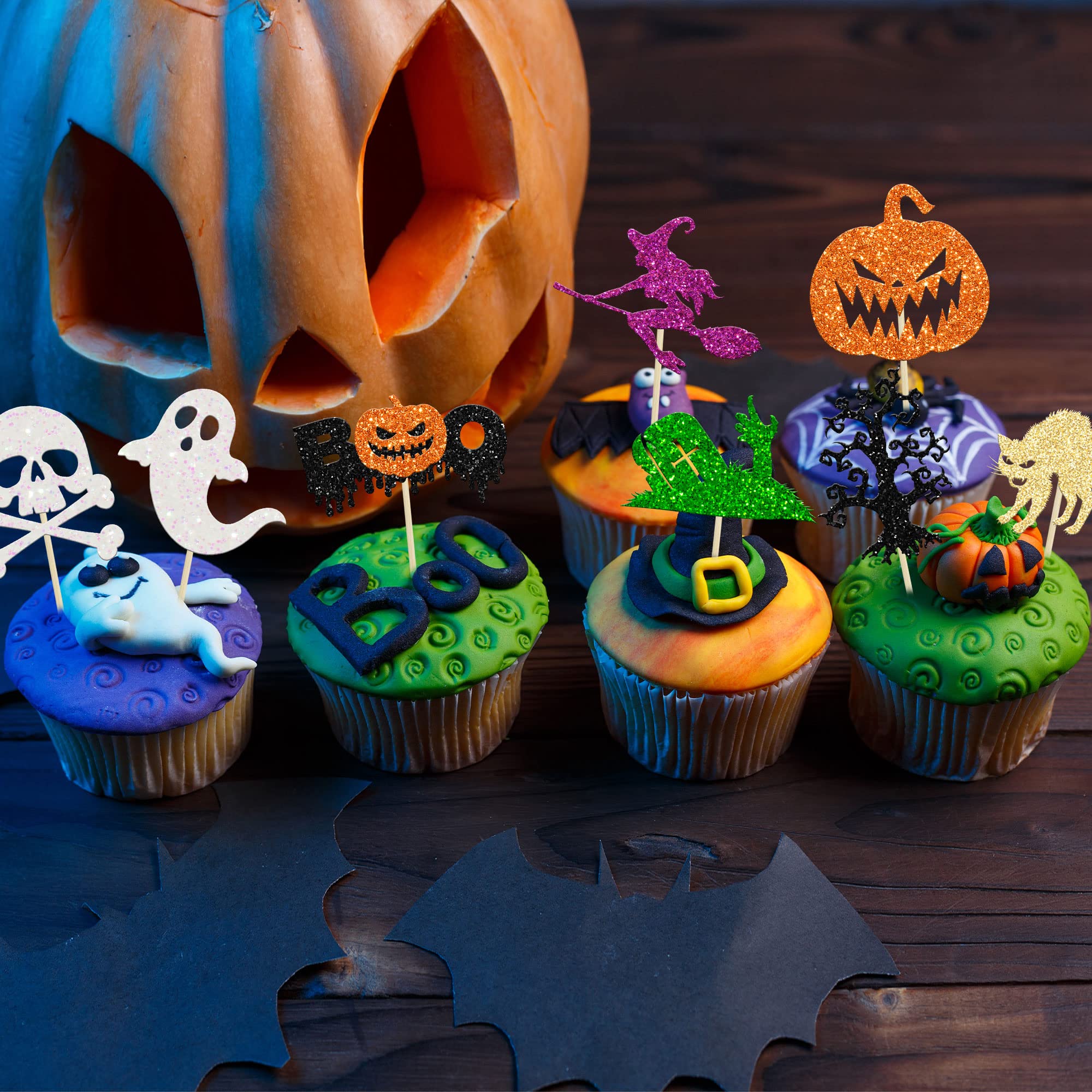 🍰【Upgrade Quality】: 24Pcs Halloween Cupcake Toppers are made of 300 gram glitter card stock and 100% food grade bamboo stick, not easy to deform and fade, smooth edges without burrs, makes these Halloween Cupcake Toppers give you a wonderful visual enjoyment. It is durable enough for long lasting use.
