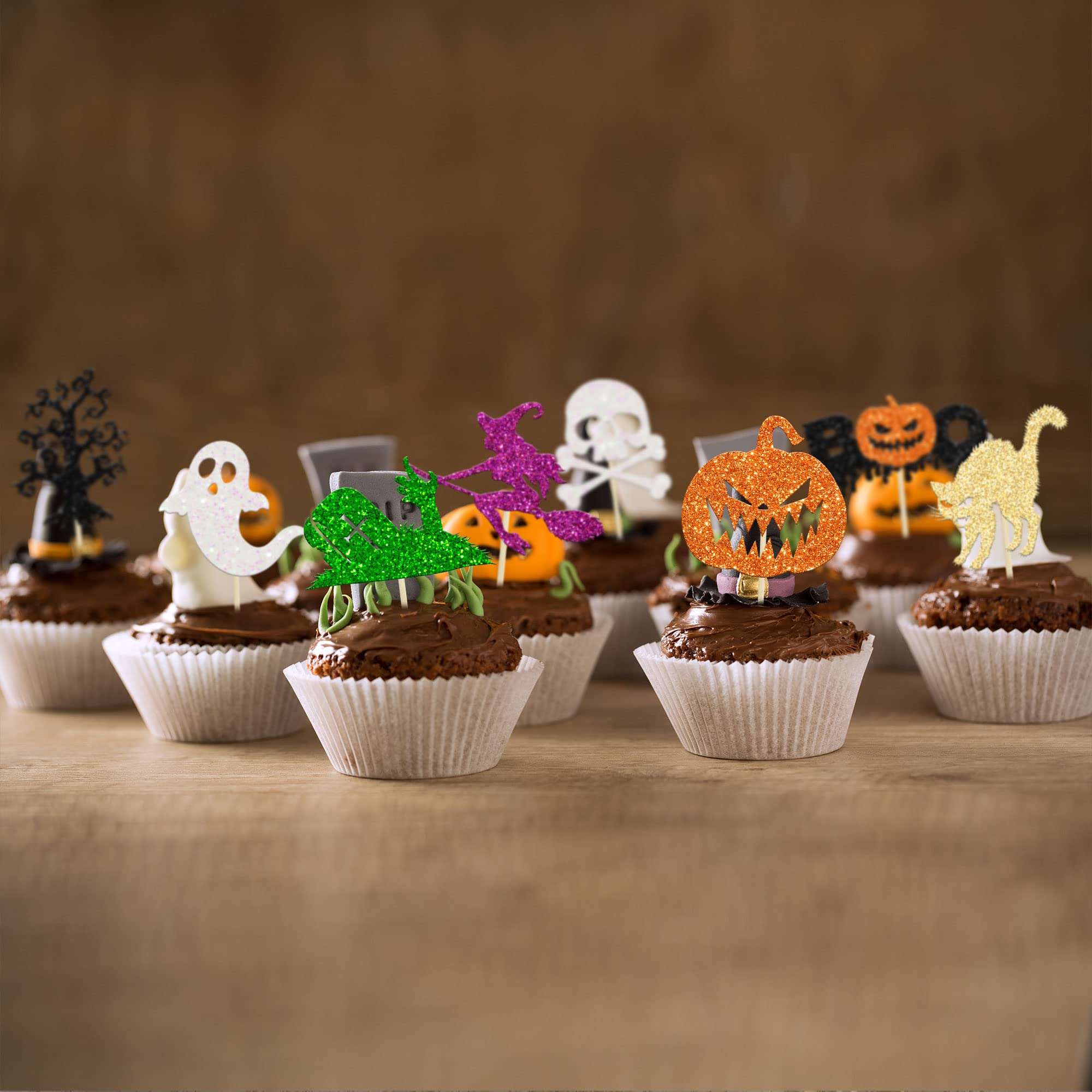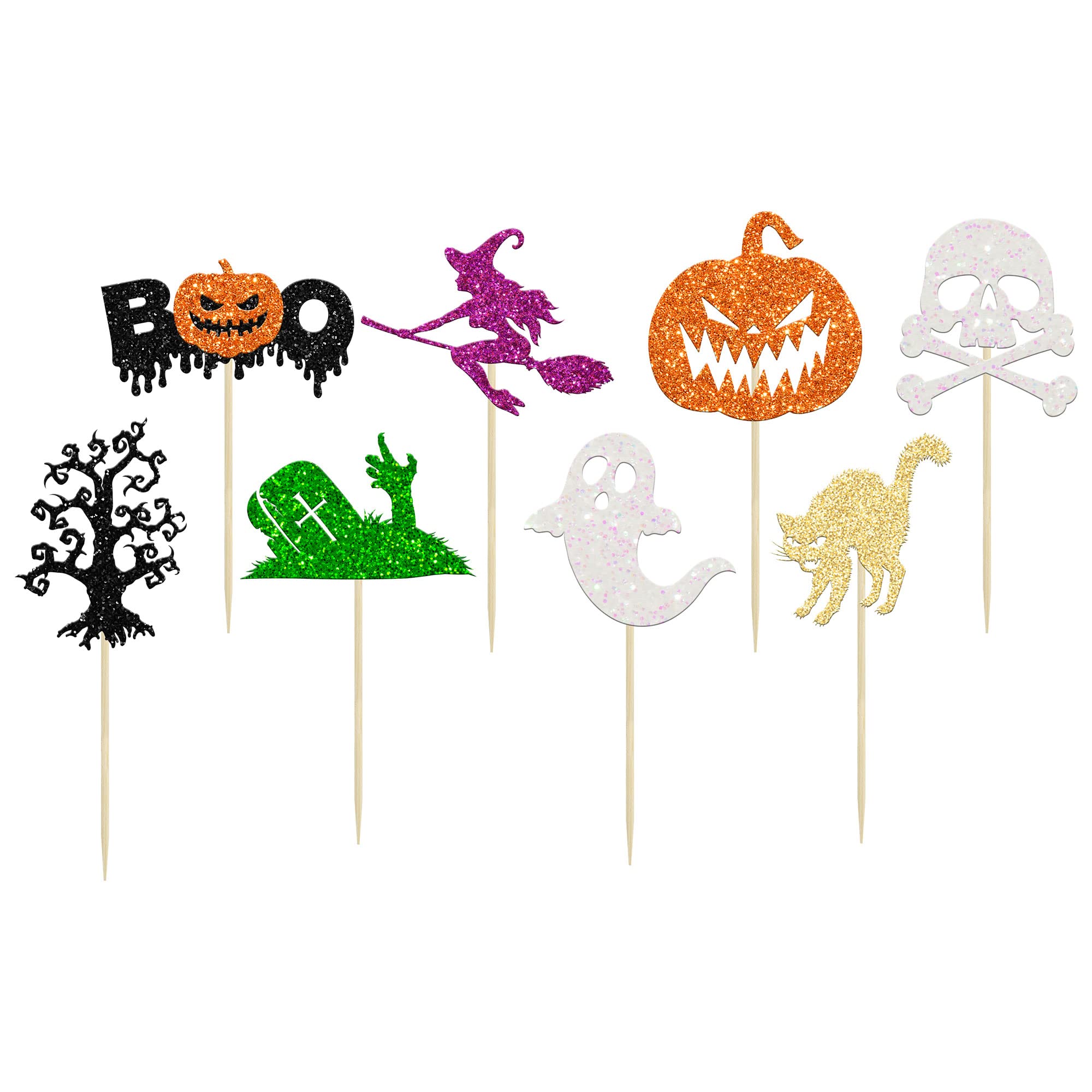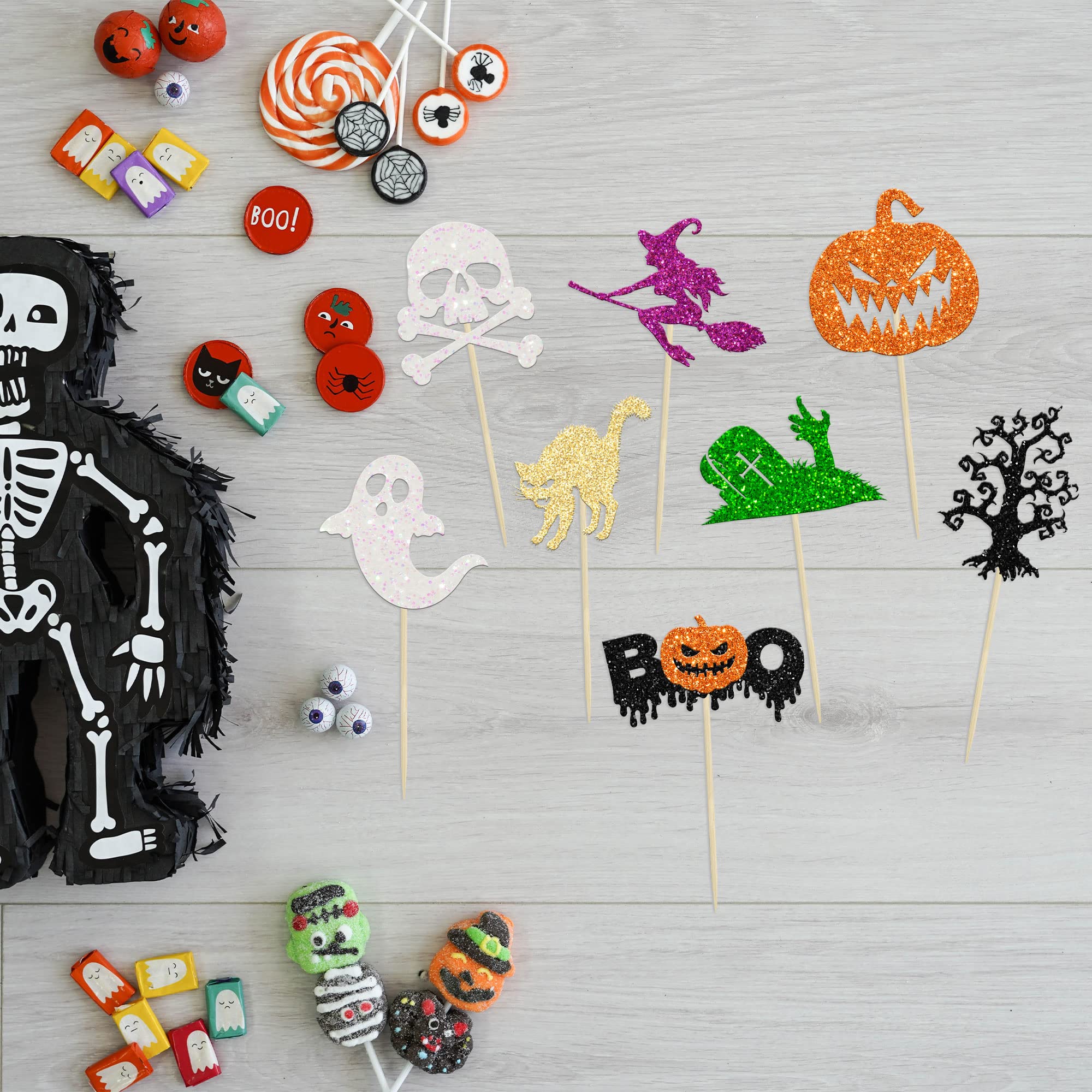 🍰【Upgrade Quality】: 24Pcs Halloween Cupcake Toppers are made of 300 gram glitter card stock and 100% food grade bamboo stick, not easy to deform and fade, smooth edges without burrs, makes these Halloween Cupcake Toppers give you a wonderful visual enjoyment. It is durable enough for long lasting use.