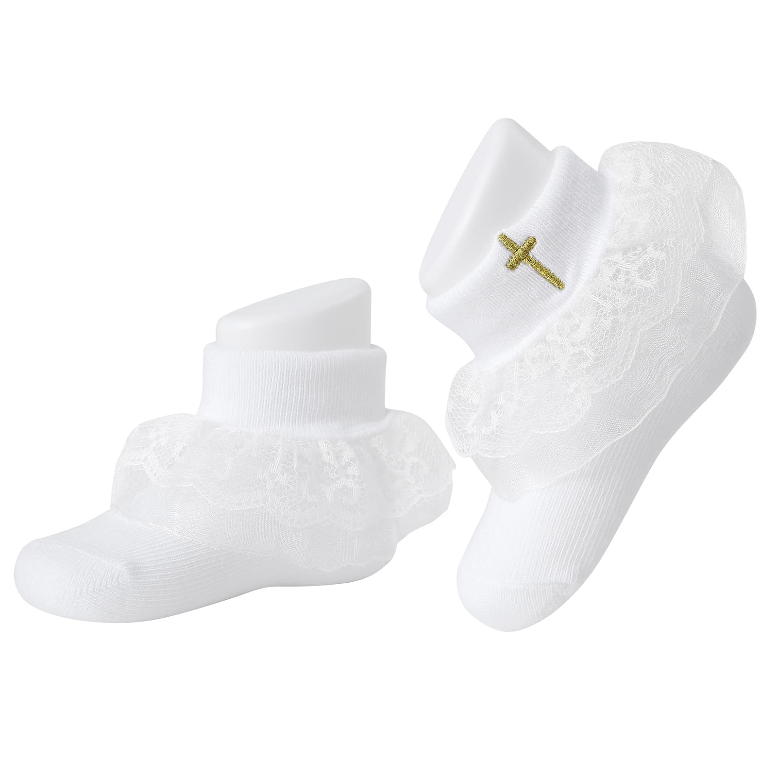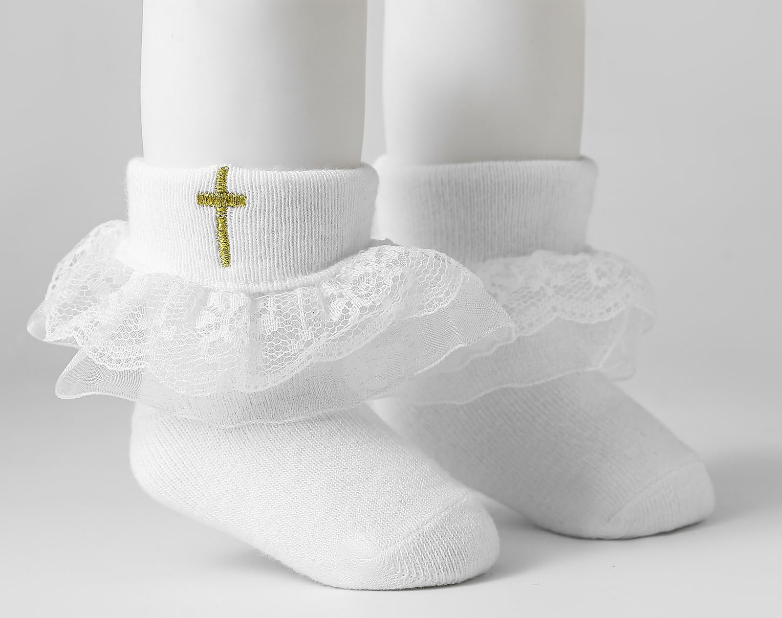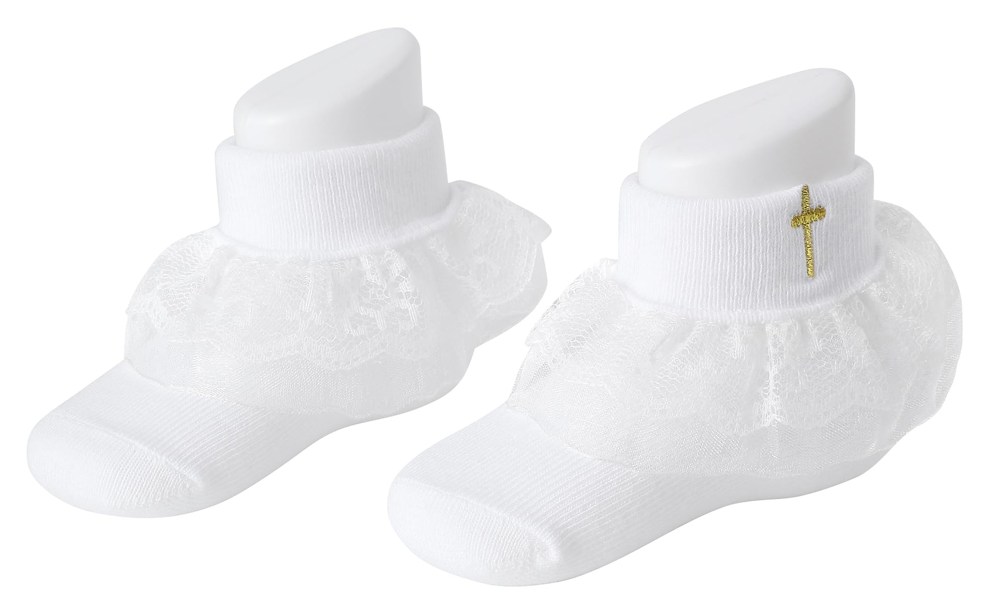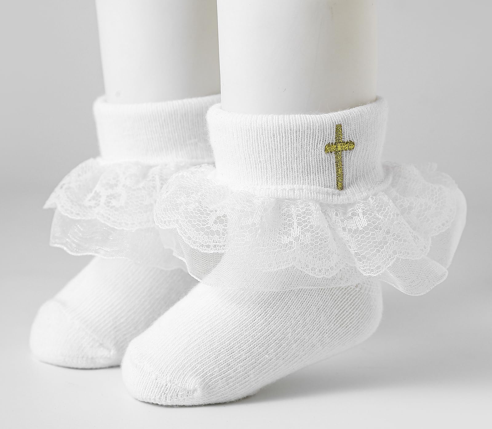 Baby girls baptismal socks with embroidery cross and beautiful frilly Lace.