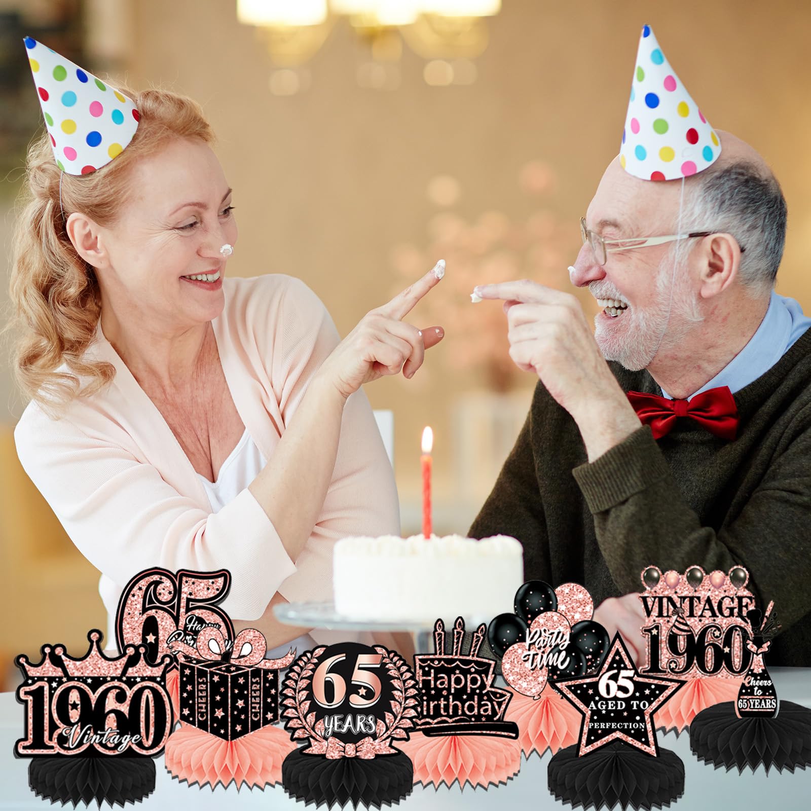 Decoration Package: Our theme is 65th birthday party, so we have unique "65" words, party "champagne", "birthday cake" and other designs, just to create a wonderful birthday party.