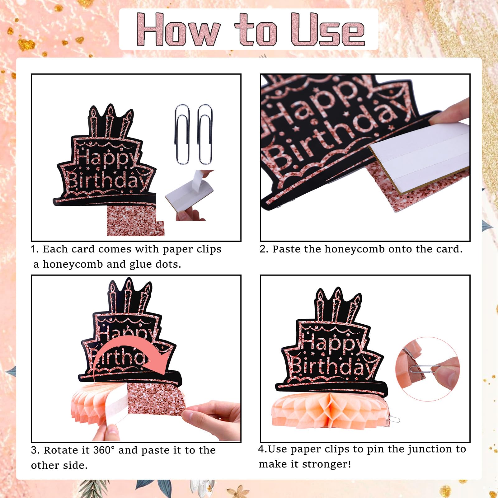 Assembly Method: Paste the honeycomb to the bottom of the card, then unfold the honeycomb and paste it to the other side of the card, and finally use paper clips to fix the overlap.