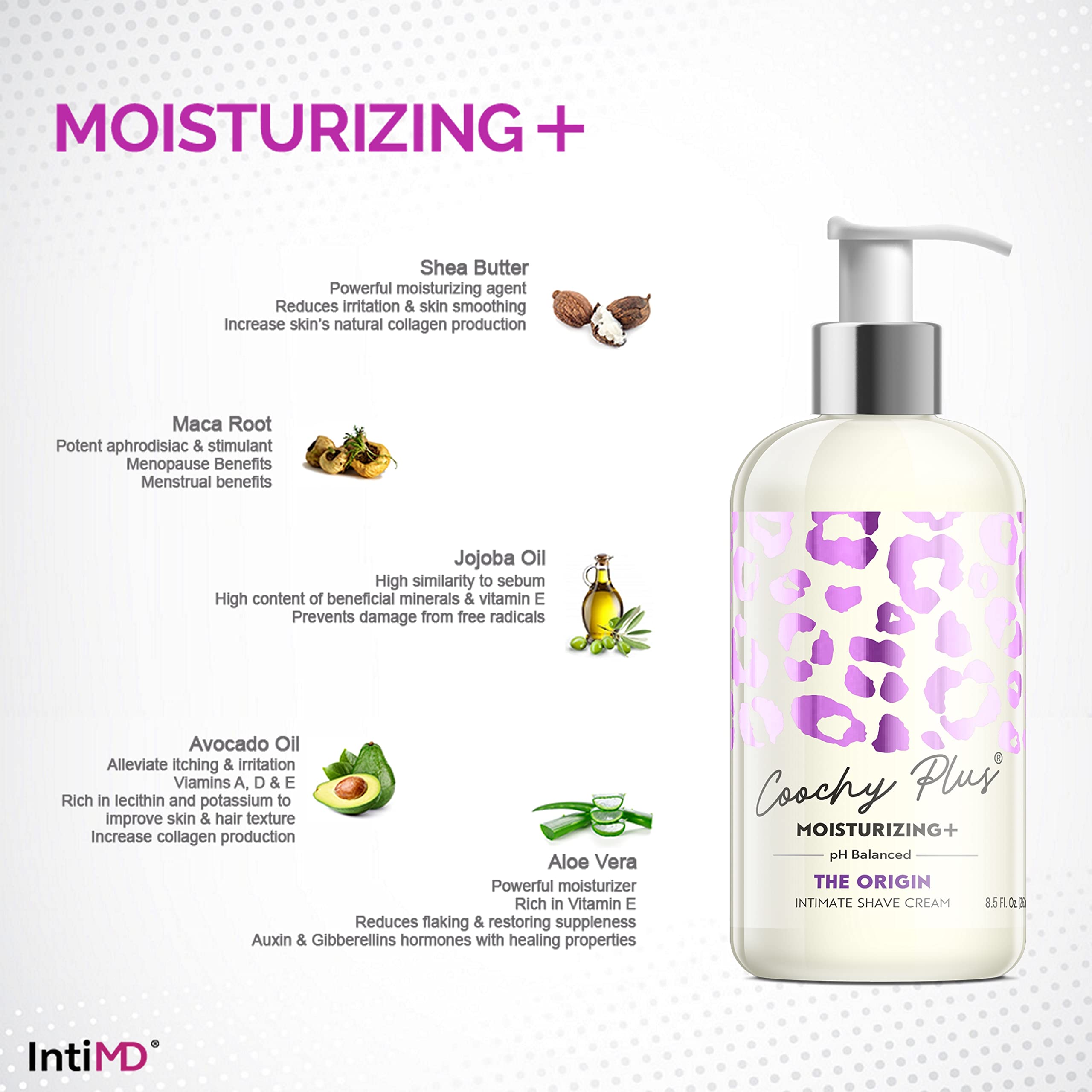 COOCHY PLUS Intimate Shave Cream is formulated with 5 powerful moisturizing, and vitamins-rich agents that dramatically improves your intimate shaving experience; Jojoba Oil / Avocado Oil / Aloe Vera / Shea Butter / Maca Root. It’s formulated for the most intimate areas of the body, for safely used on any other parts of the body. Helps soften the most coarse body hair, such as pubic hair or underarm hair. MOISTURIZING+ agents form an invisible shield on your skin to deliver a closer shave.