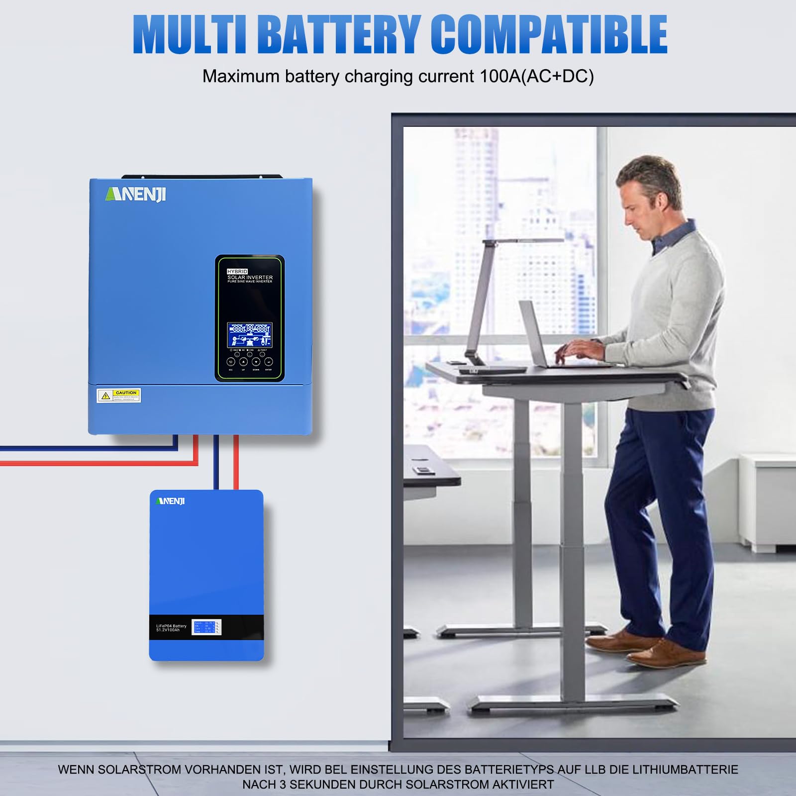 【100A MPPT Solar Charger & Maximum Efficiency】This hybrid inverter features a built-in 100A MPPT solar charger, optimizing energy harvest from PV arrays with a 500V max input. It supports up to 4,000W solar input and operates within a wide MPPT voltage range (60V–450V), ensuring compatibility with most solar panels. High conversion efficiency (97% PV to AC) reduces energy waste, ideal for off-grid or backup systems.