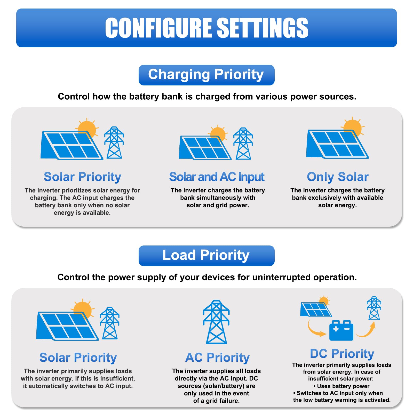 【Four Output Priority Modes】Key modes include UTL Mode as the default utility power priority for loads, SOL Mode with solar priority for loads supplemented by utility power if insufficient, SBU Mode with solar priority using battery supplementation if needed, and SUB Mode with solar priority charging supplying loads supplemented by utility power if insufficient.
