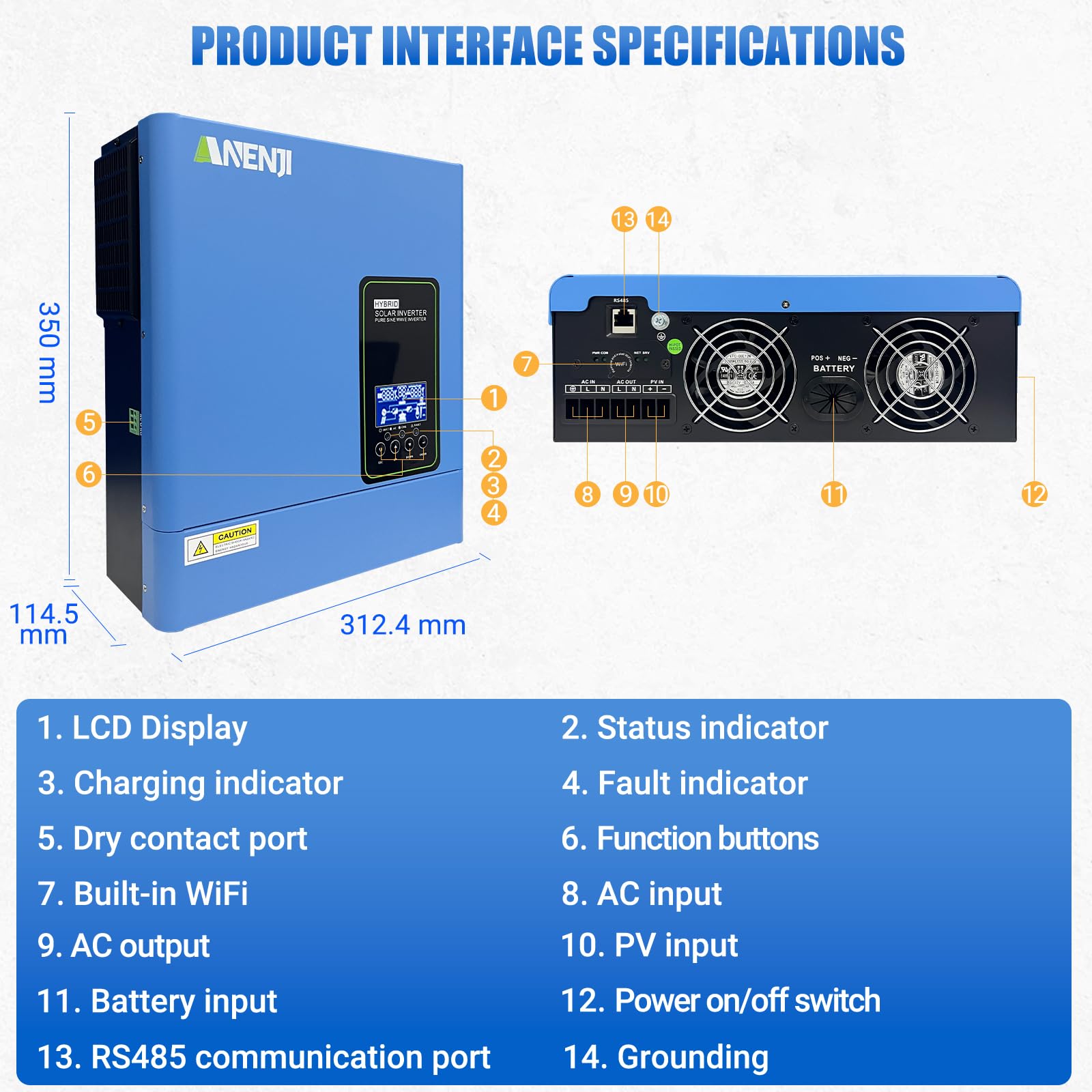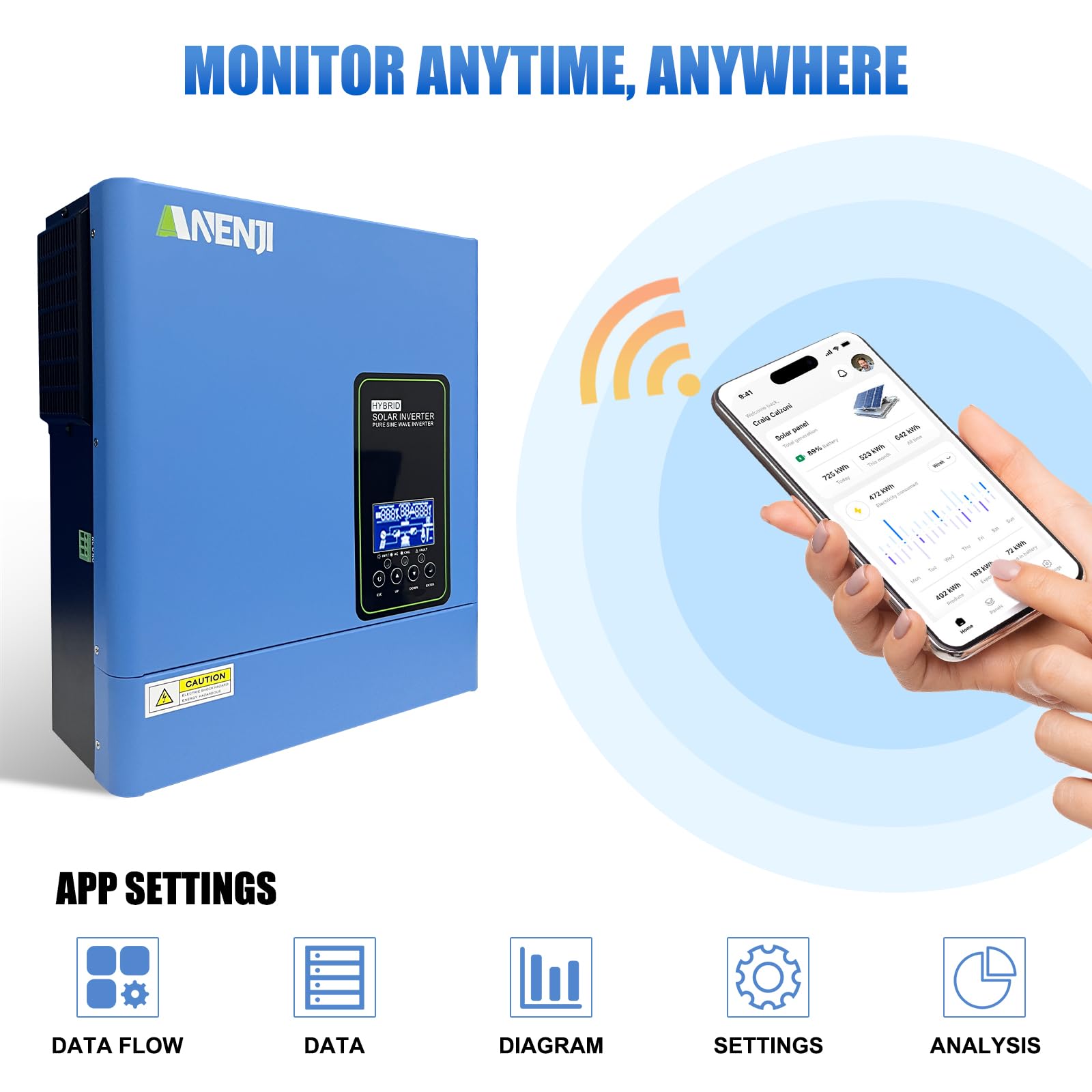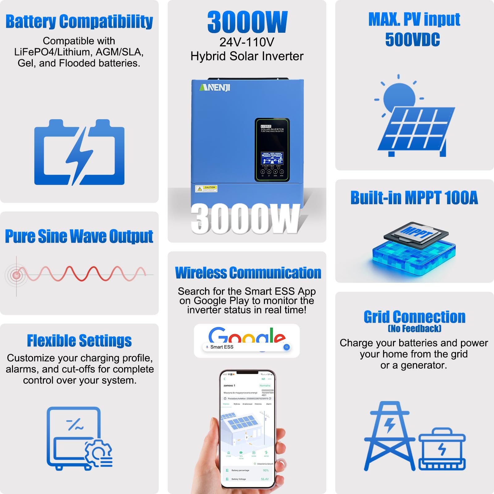 【Built-in WiFi for Remote Monitoring】Includes WiFi connectivity for real-time tracking of power usage, PV input, and battery status via the SmartESS app. Adjust settings remotely (e.g., output priority, charging current) and receive fault alerts (e.g., overload, high temp), reducing troubleshooting time.