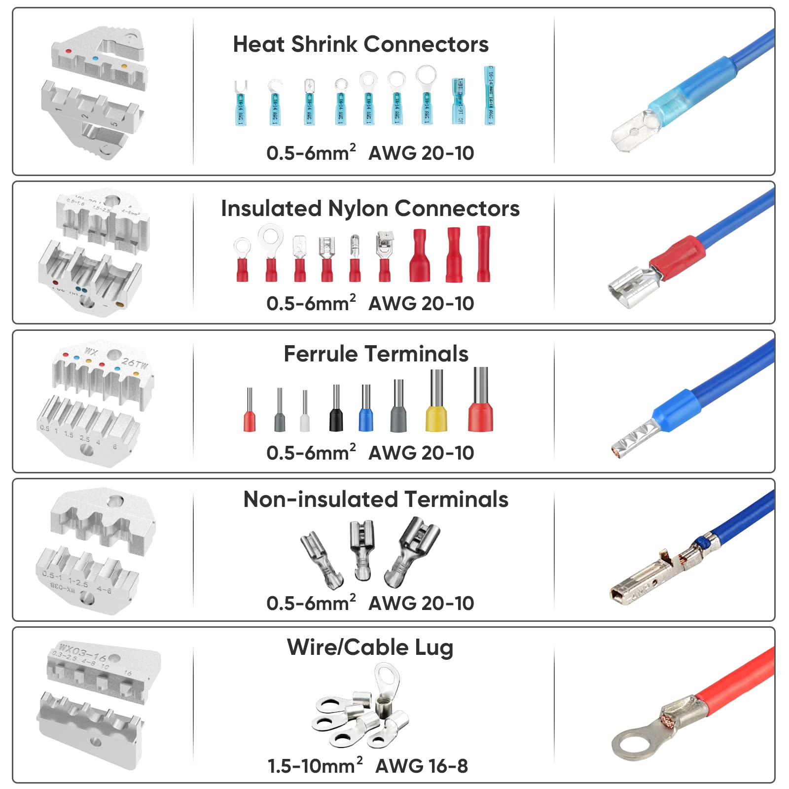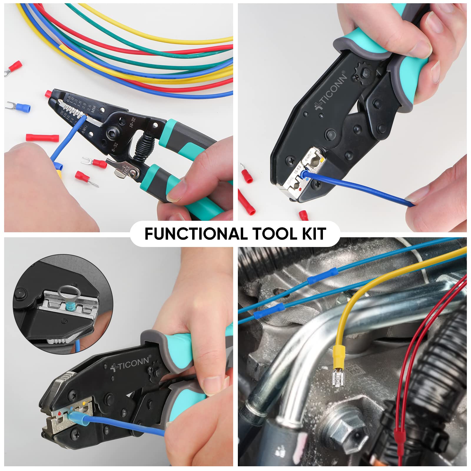 ONE KIT FOR ALL: The crimper combokit comes with a connector crimpeing too, a two in one wire striper and cutter and five wire crimping jaws. The tool kit works on all heat shrink/non-heat shrink connectors and ferrule terminals from TICONN and other brands. An ideal tool kit for electricians, DIYer, mechanics and so on.