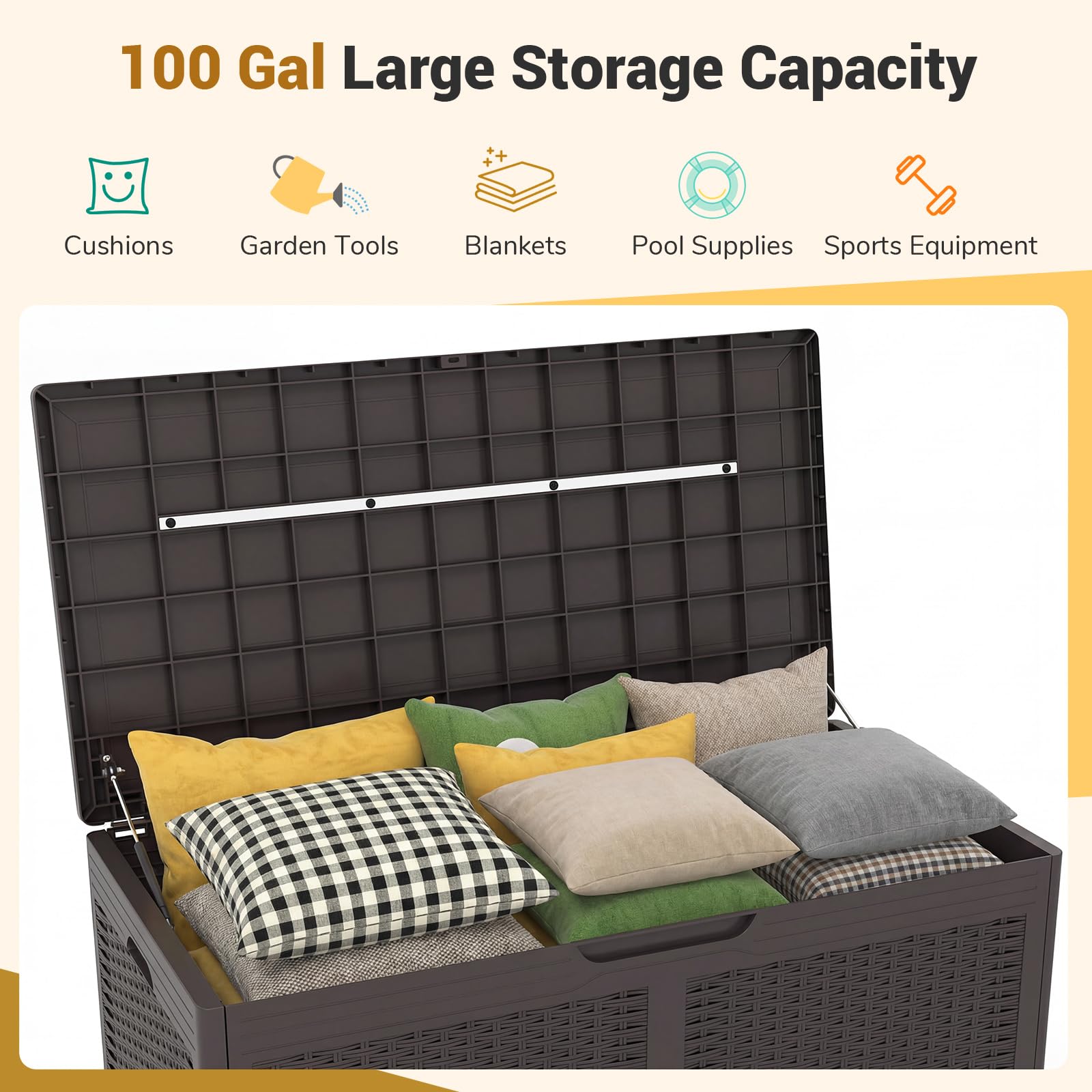 Spacious Storage Solution: Elevate your outdoor living space with the storage box boasting a substantial 100-gallon capacity. Perfectly sized for holding cushions, garden tools, blankets, pool supplies, sports equipment, etc, it is the ultimate clutter eliminator.