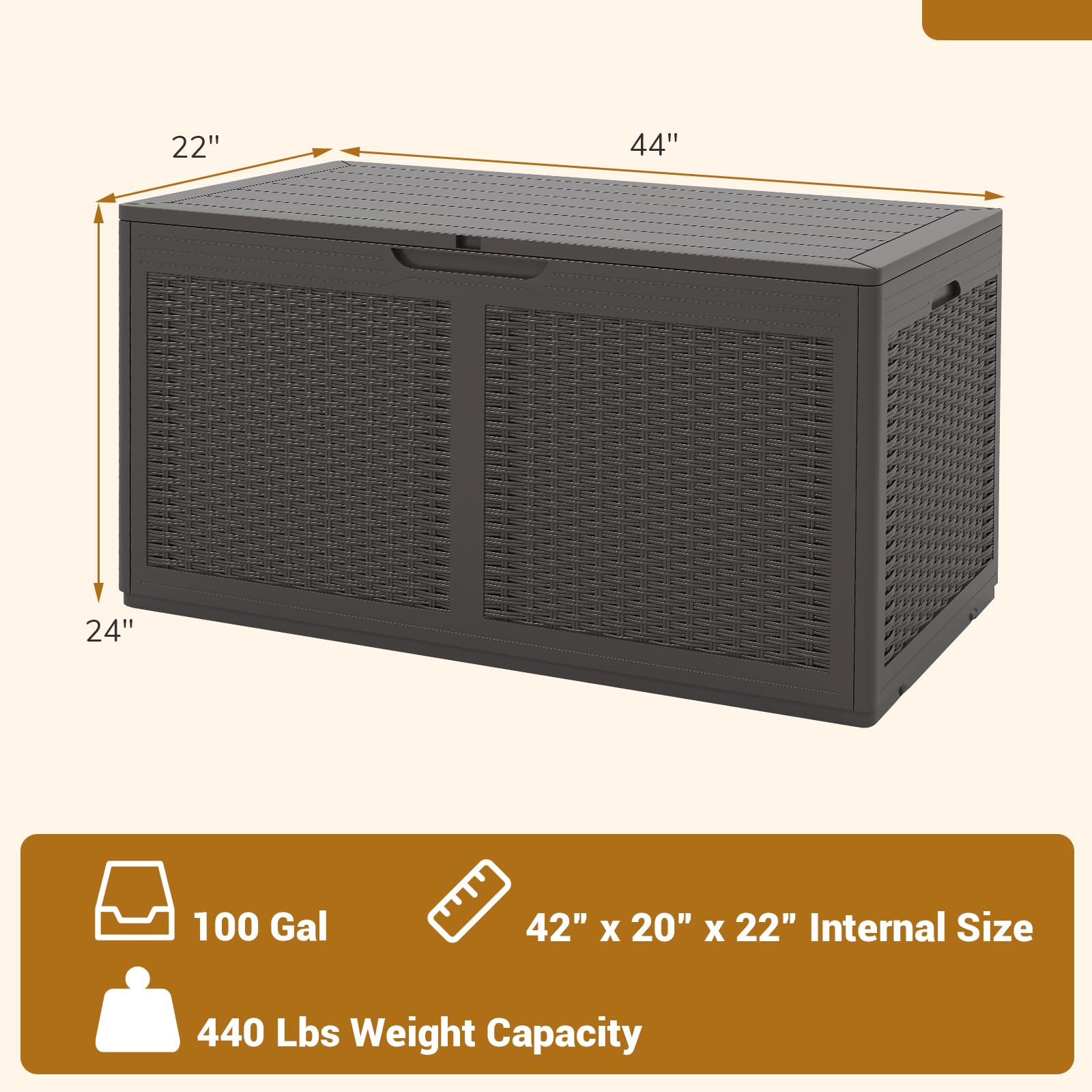 Description: Discover the perfect blend of function and style with the outdoor storage box. It provides a generous 100-gallon capacity for your storage needs and can perform perfectly as a bench or a table. Furthermore, the robust construction supports up to 440 lbs, allowing the patio box to comfortably seat 2 people. Plus, it features a lockable lid to safeguard your belongings and is supported by metal gas struts and a reinforced metal rod. The delivery box is equipped with smooth wheels and side handles, making relocation simple and stress-free. The faux wicker finish adds a touch of sophistication and is crafted to seamlessly complement your outdoor decoration. Elevate your outdoor living with this multi-use storage solution, a must-have for a well-organized and elegant outdoor area. Features: 100 gal large storage capacity keeps space neat Waterproof material ensures quality and durability for reliable use Lockable lid feature enhances security; lock not included Sturdy metal reinforcements including gas struts and rod for durability Serves as a storage box and a bench or table Supports up to 440 lbs and seats up to 2 people Smooth wheels and side handles for portability Assembly needed Specifications: Color: Brown/Black/Grey Material: PP, Metal Overall Dimensions: 44" x 22" x 24" (L x W x H) Capacity: 100 Gal Weight Capacity of Lid: 440 lbs Net Weight: 25 lbs Package includes: 1 x Outdoor Storage Box 1 x User Manual