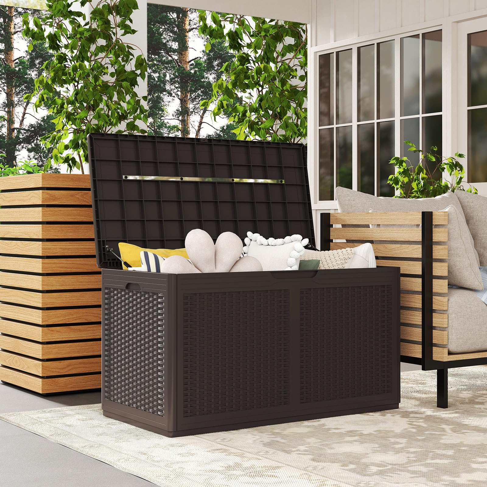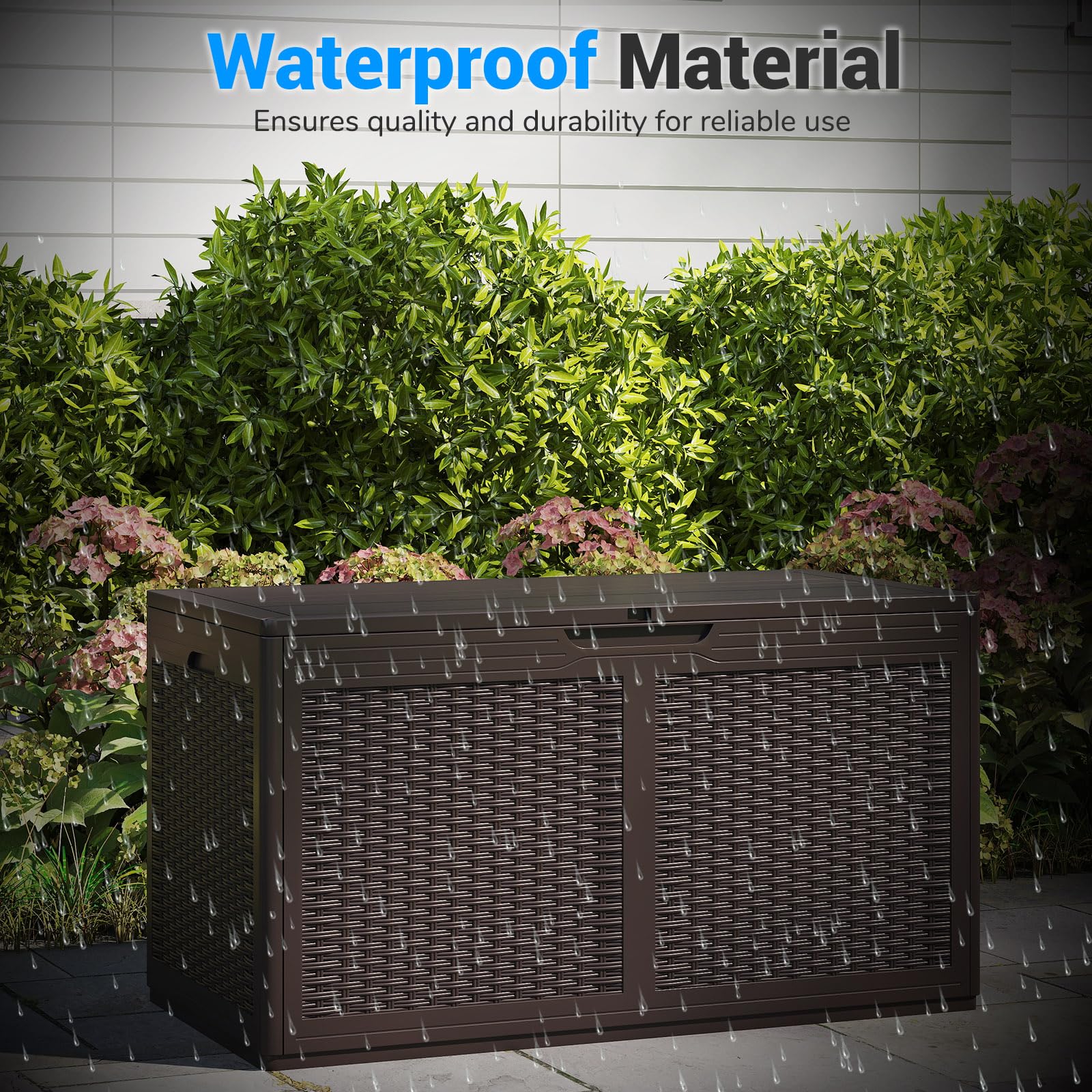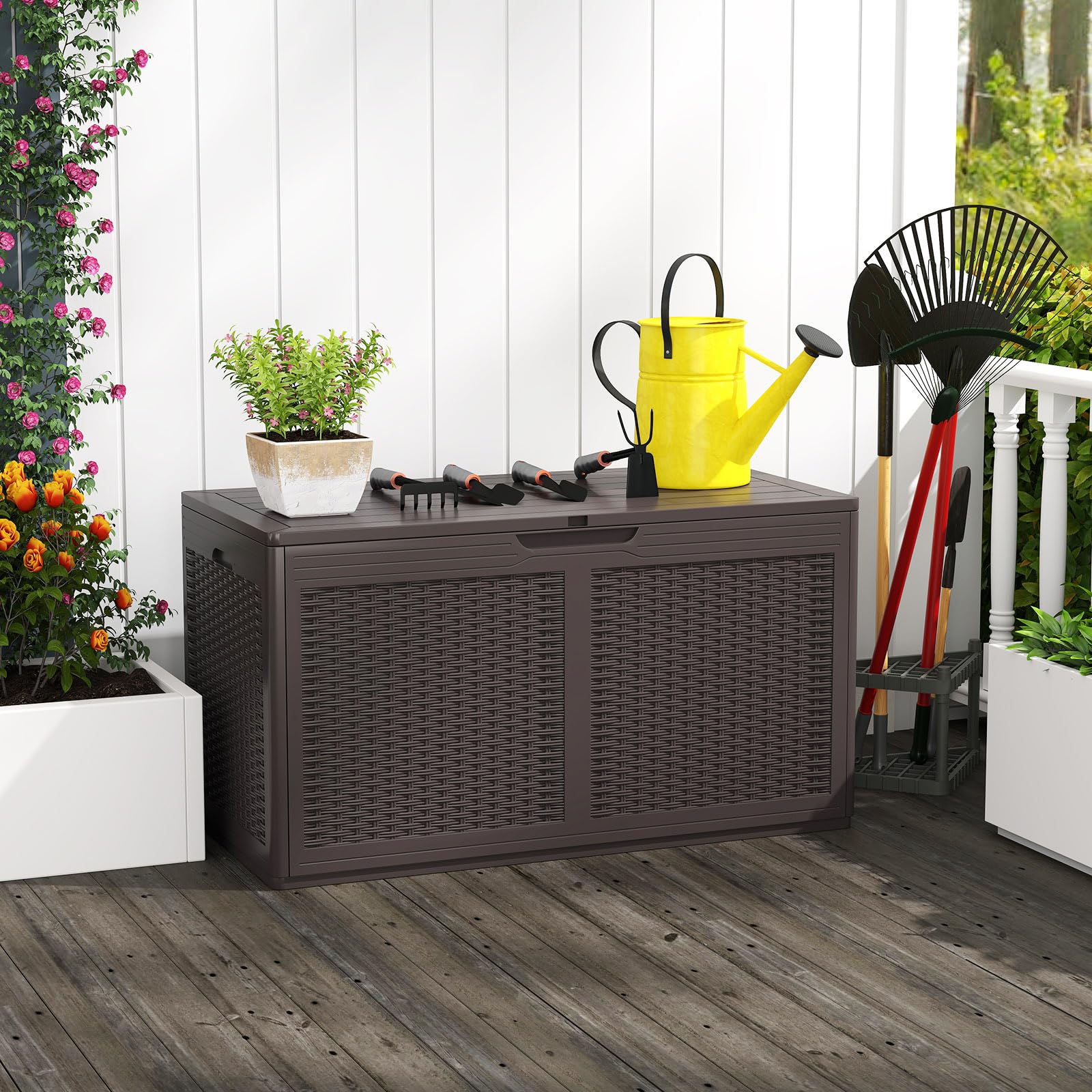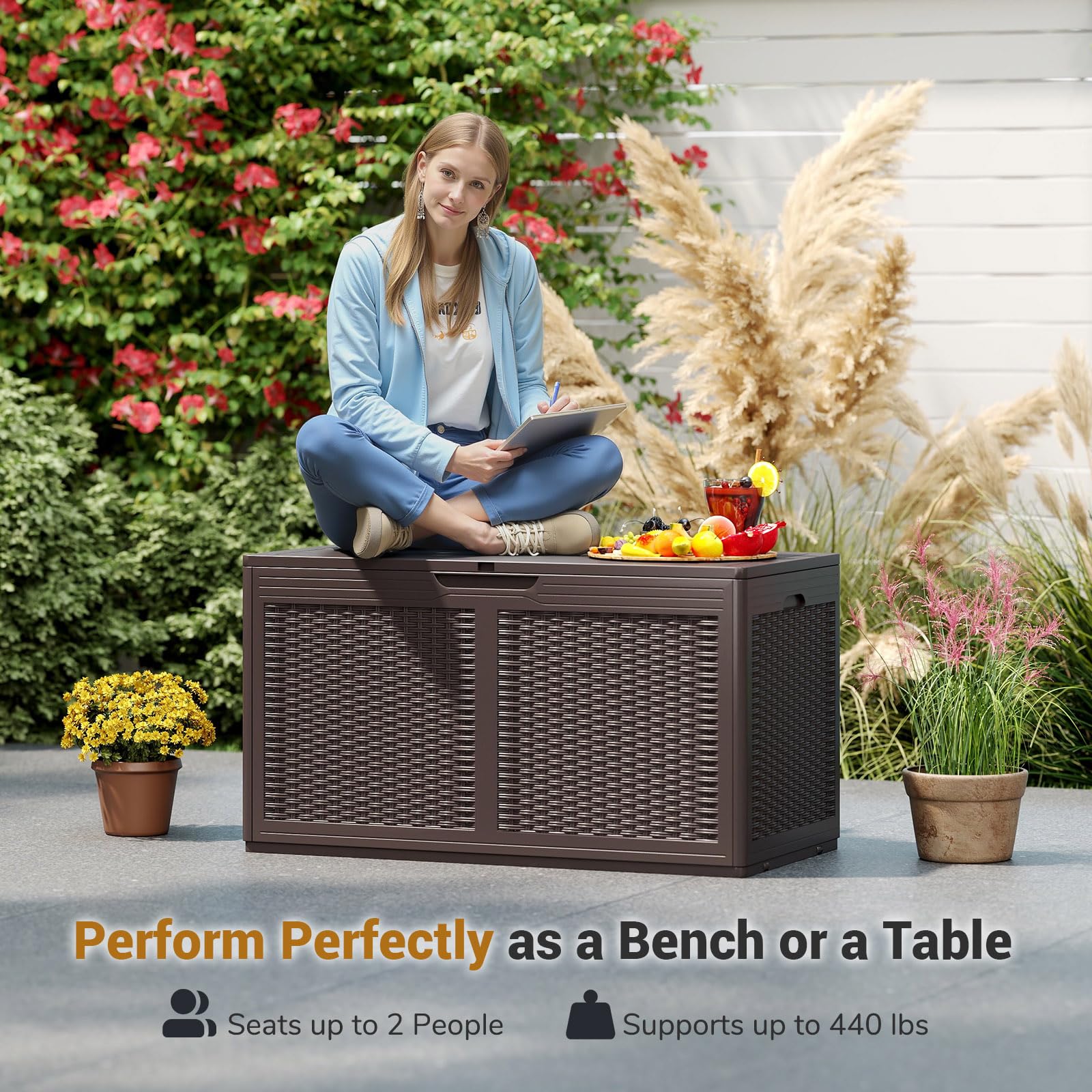 Multifunctional Use: Not just a storage solution, the resin container doubles as a stylish bench or table that can comfortably seat up to 2 people. With a weight capacity of 440 lbs, it provides a practical yet chic addition to patio, garden and so on, blending functionality with leisure.