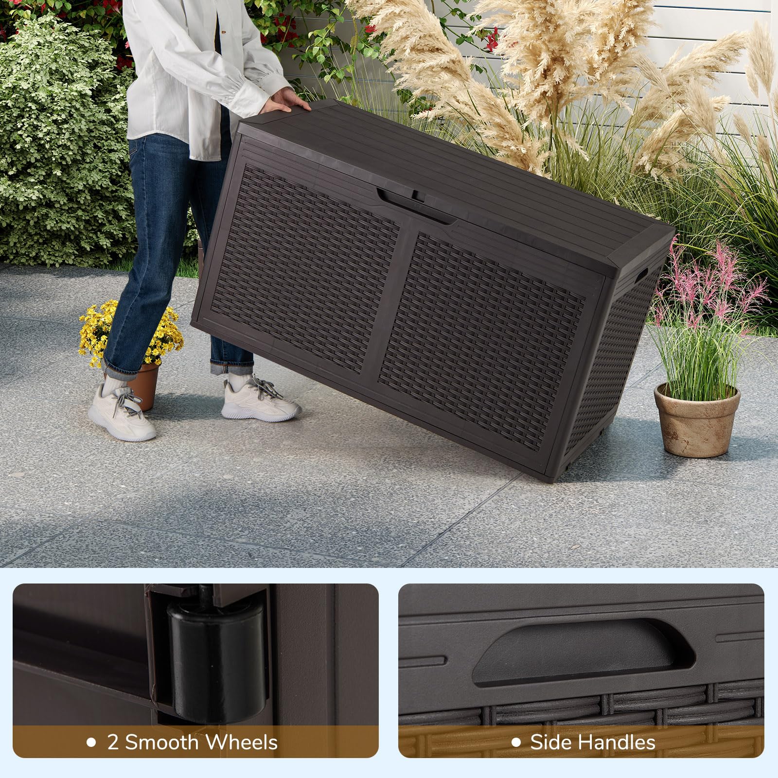 Mobile & Convenient Design: Thanks to the 2 smooth wheels, the delivery box moves effortlessly, offering flexibility in maintaining your outdoor aesthetics. Besides, the built-in side handles provide convenience and let you experience ease of carry.