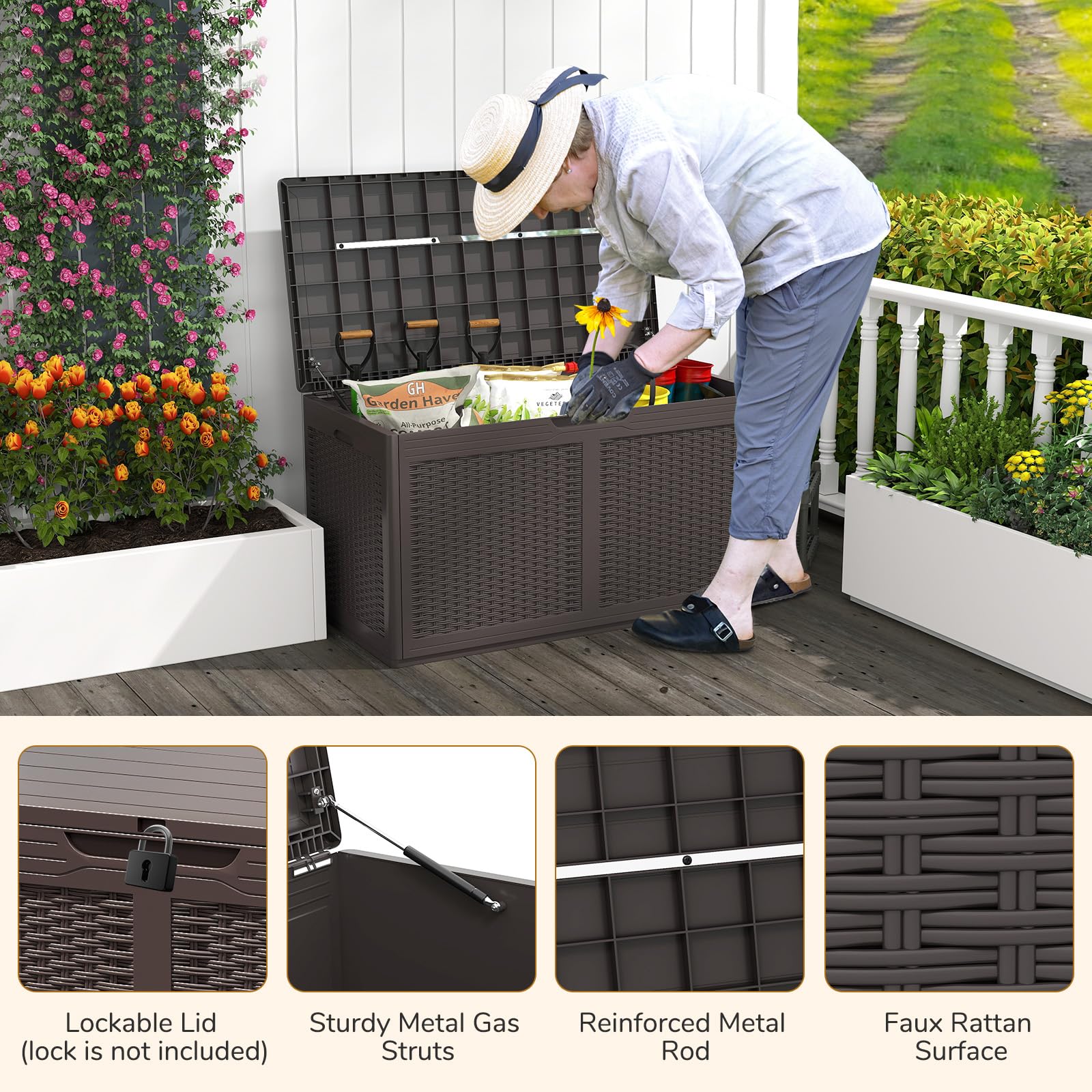 Durability & Security: Constructed with robust waterproof material and reinforced with sturdy metal gas struts and a metal rod, the deck box promises longevity and resilience. Mover, the lockable lid (lock is not included) adds an extra layer of security to keep your belongings safe.