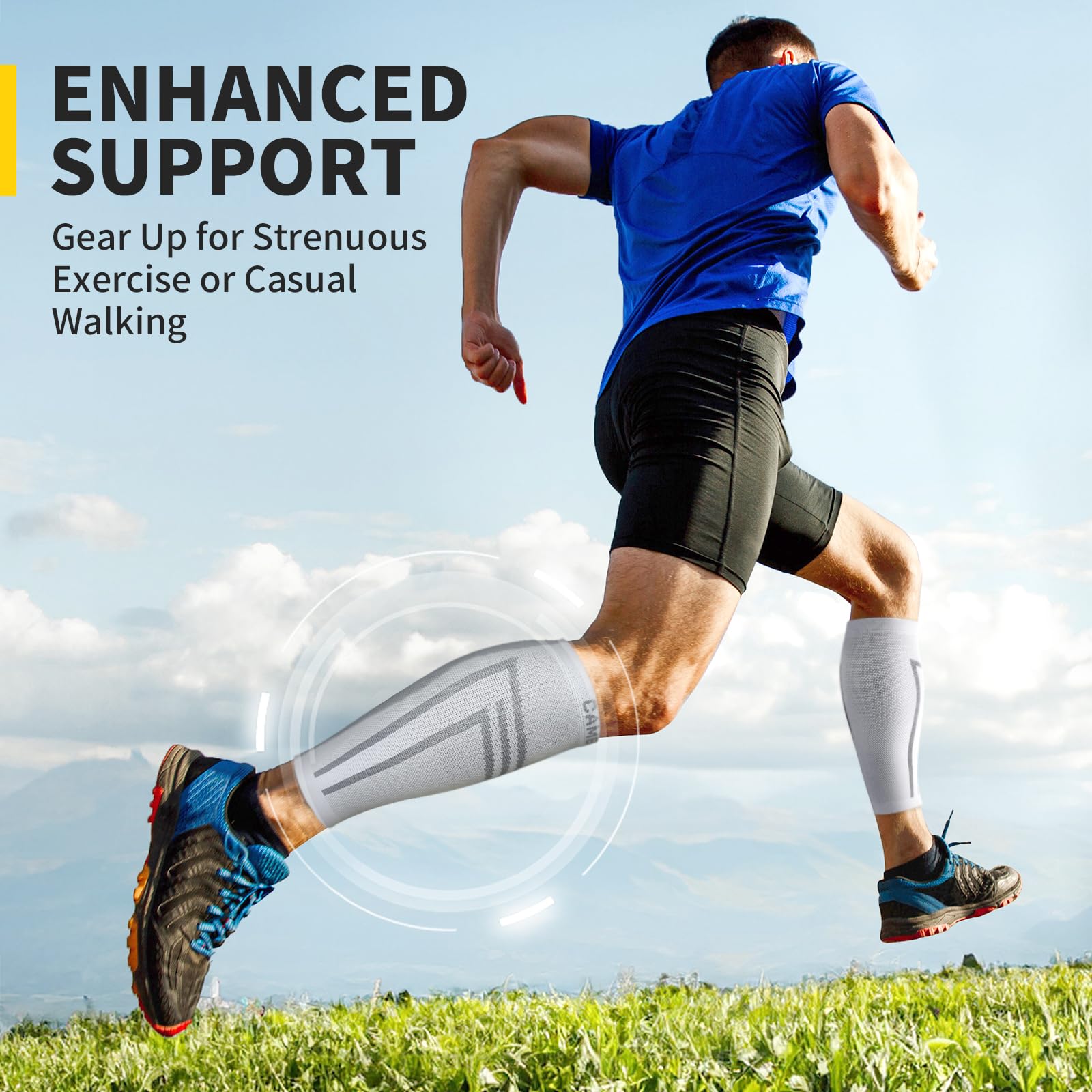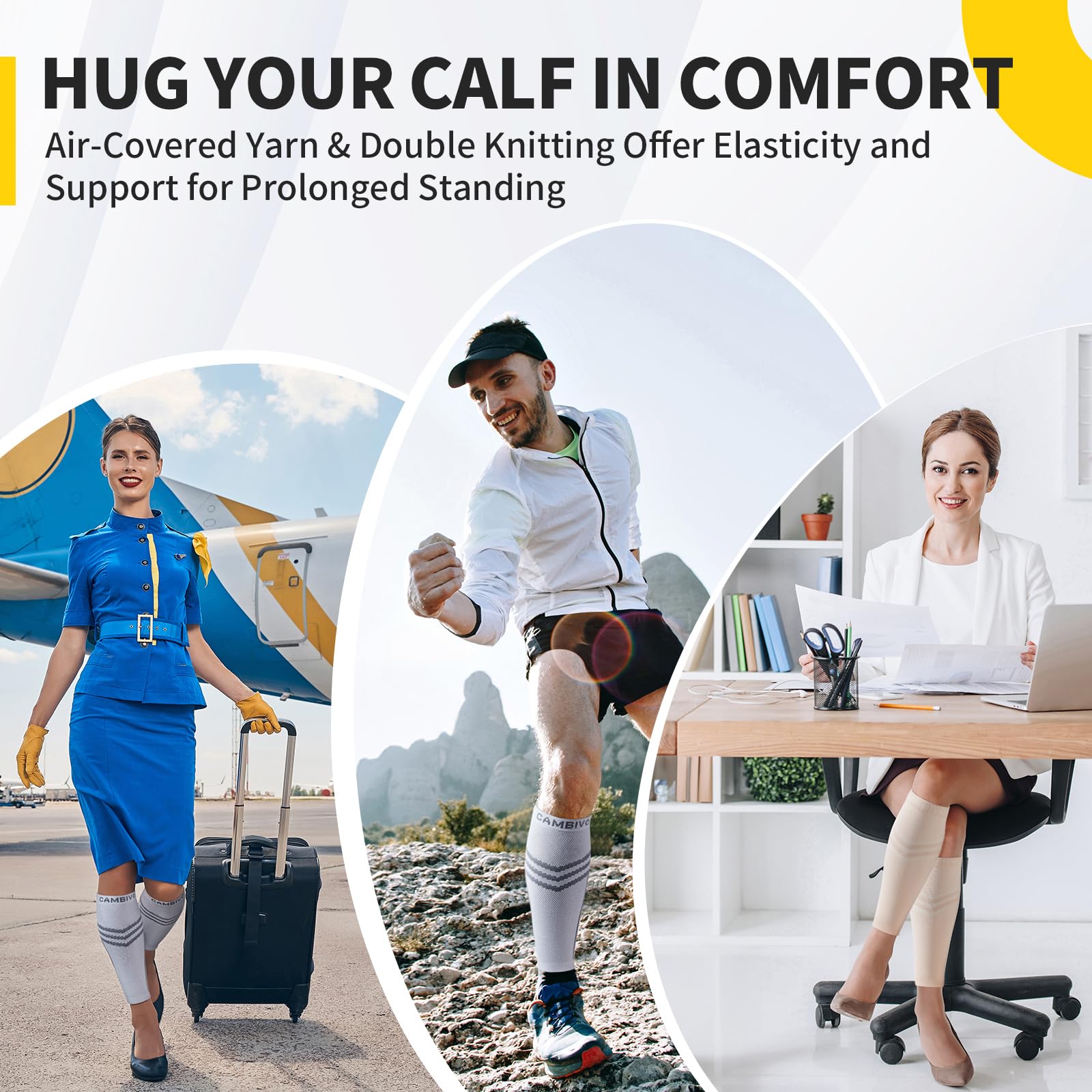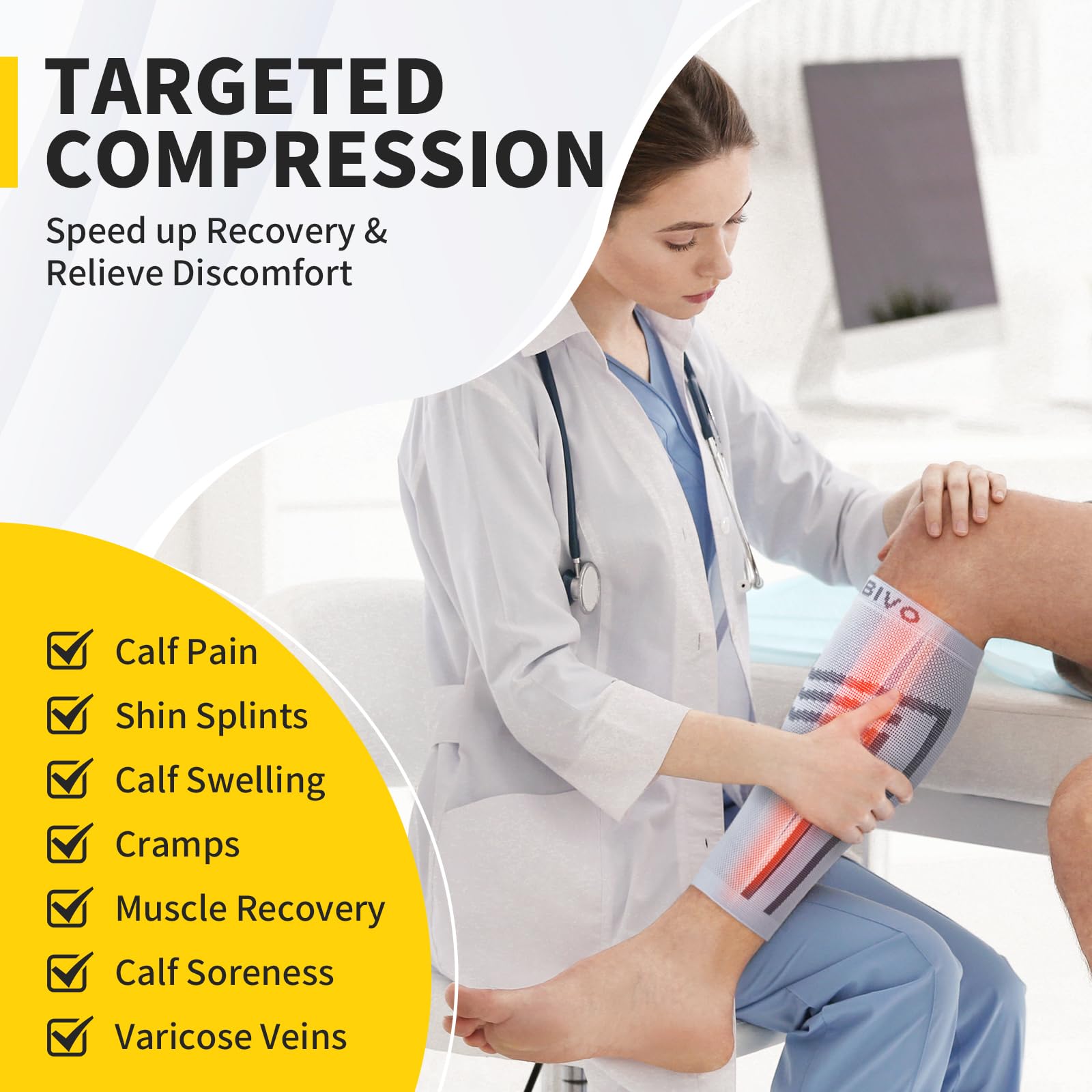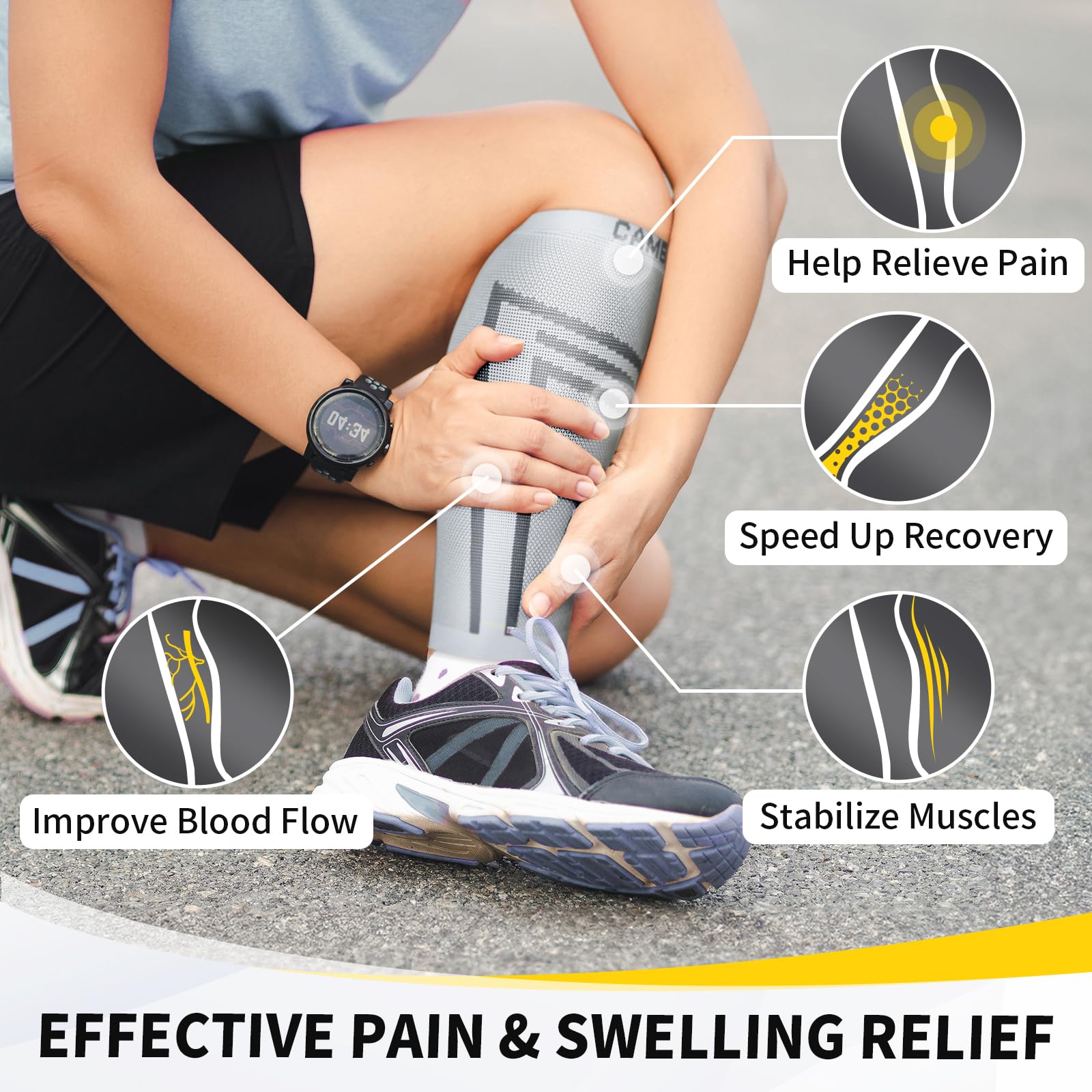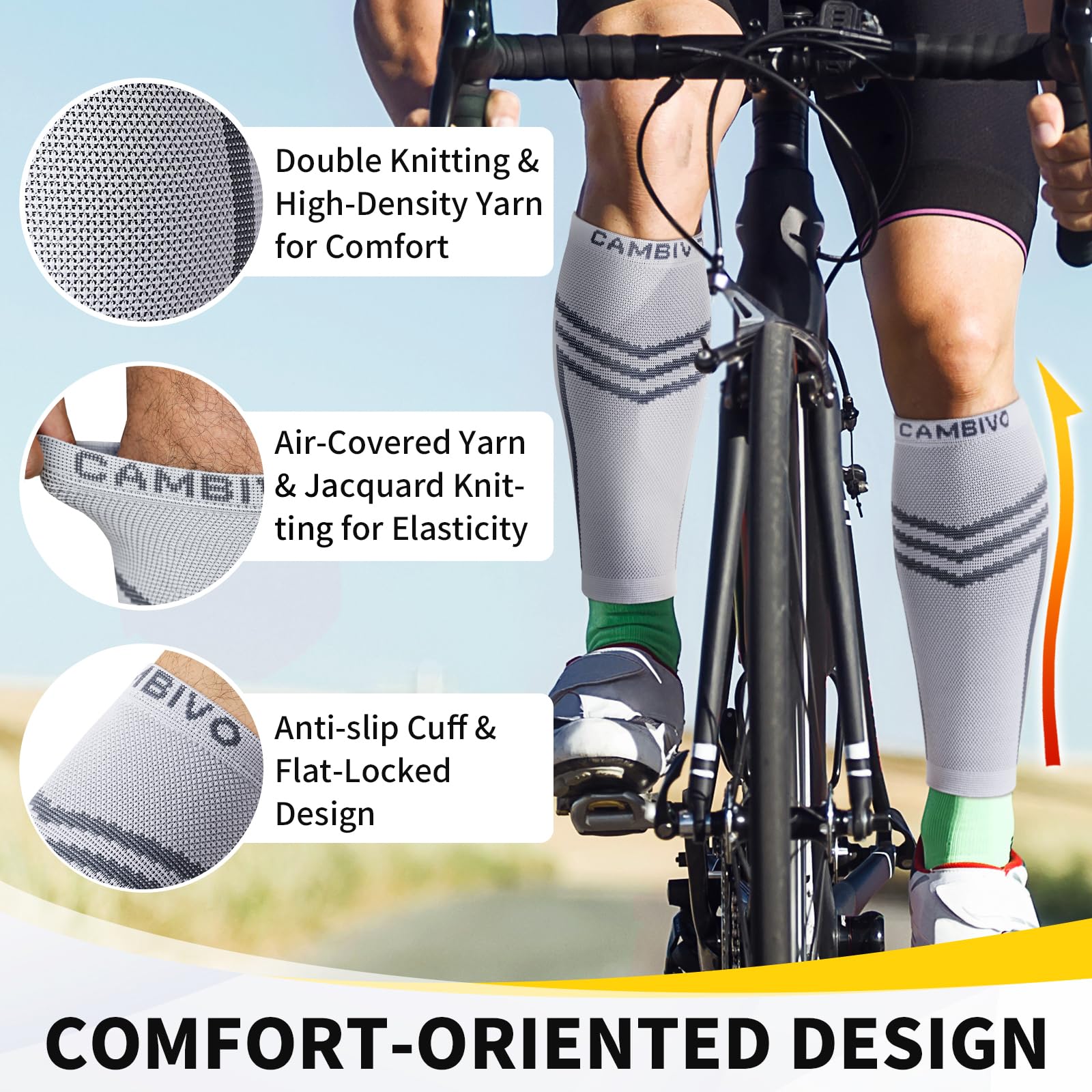 Graduated Compression: Cambivo leg compression sleeve applies graduated pressure to the calf, shin, and Achilles, providing extra support to keep your muscles working well; these shin splint compression sleeves fight gravity and boost circulation by increasing the velocity of venous blood flow back to the heart; the compression sleeves for legs help support weak calves and soothe calf pain caused by shin splints, varicose veins, stiffness, Achilles tendinitis, swelling, cramps, and fatigue.