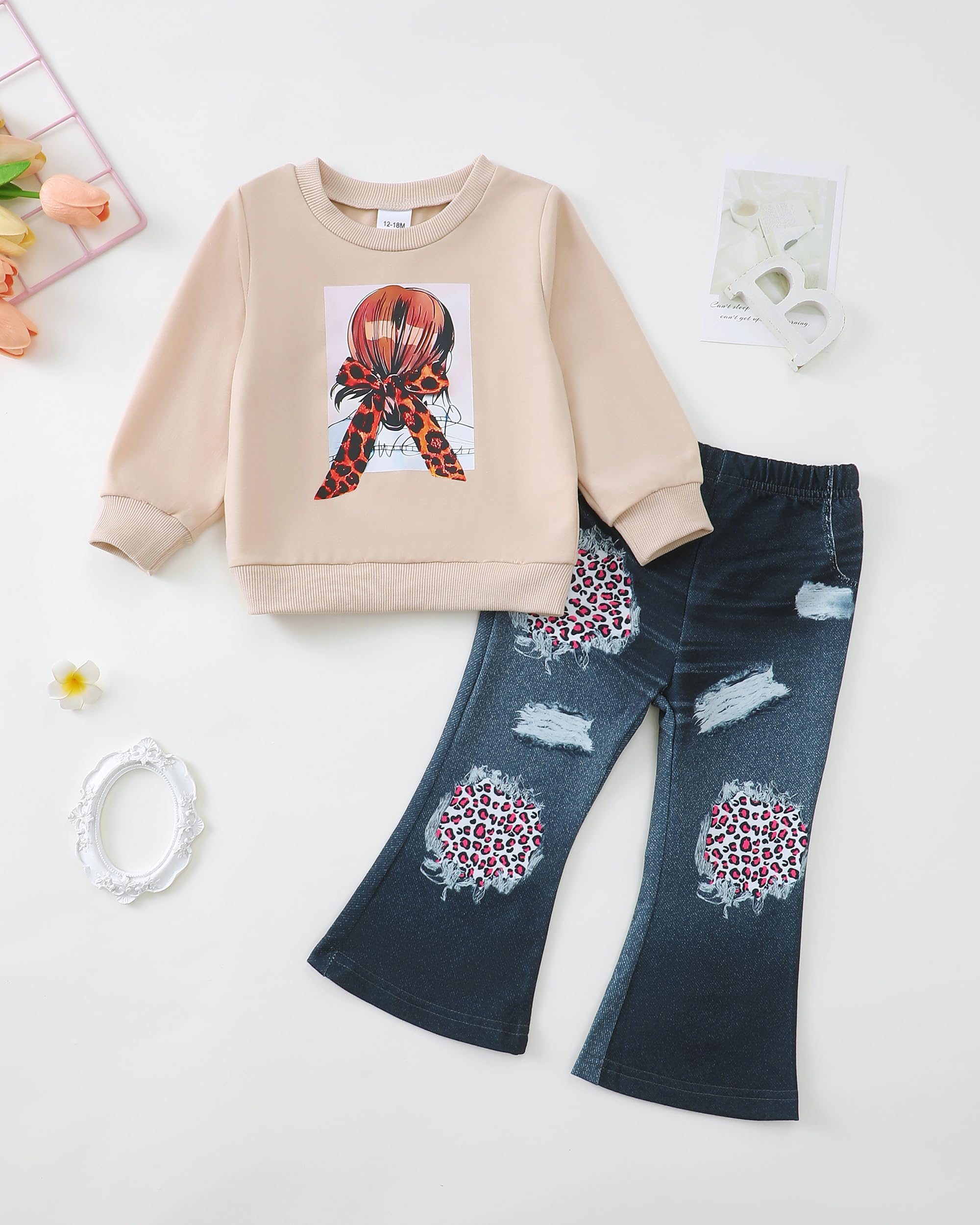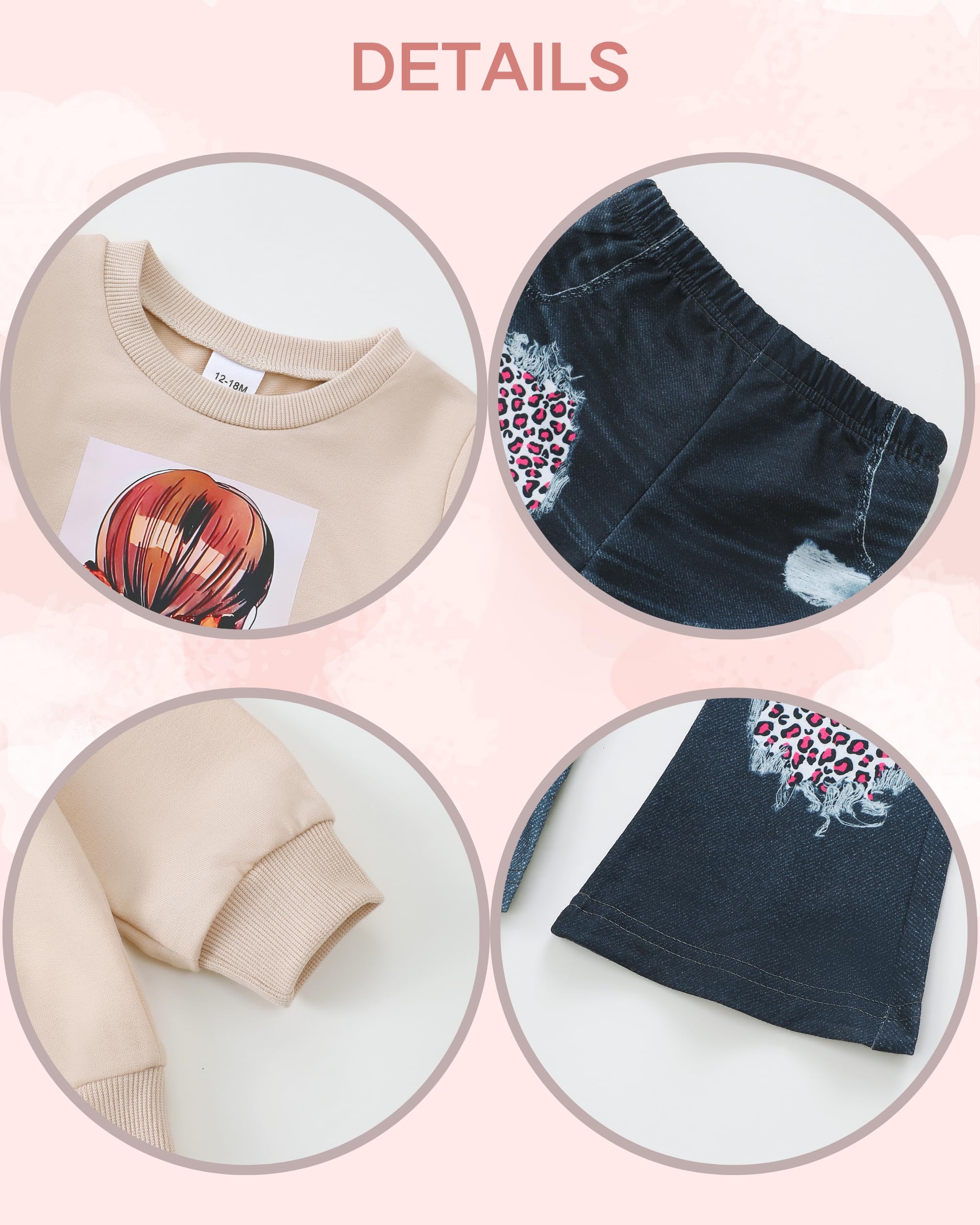 Fun Design: Our baby girl bell bottom outfit feature playful prints of flowers, cats, butterflies, and girl faces on the top. These baby pants showcase a trendy faux denim print, offering the look of denim with added softness. The elasticated waistband ensures a comfortable, perfect fit, making this clothing set ideal for casual wear or for creating a chic look. Please note: these are not real denim, and the pants do not have pockets!
